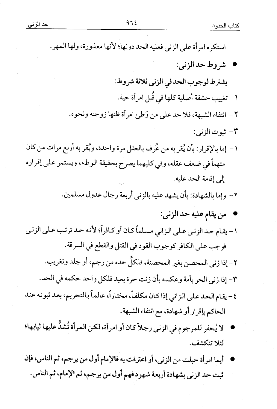 4 - يقام الحد على الزاني إذا كان مكلفاً، مختاراً، عالماً بالتحريم، بعد ثبوته عند الحاكم بإقرار أو شهادة، مع انتفاء الشبهة.