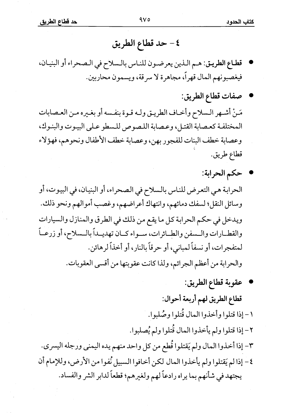 - قطاع الطريق: هم الذين يعرضون للناس بالسلاح في الصحراء أو البنيان، فيغصبونهم المال قهراً، مجاهرة لا سرقة، ويسمون محاربين.