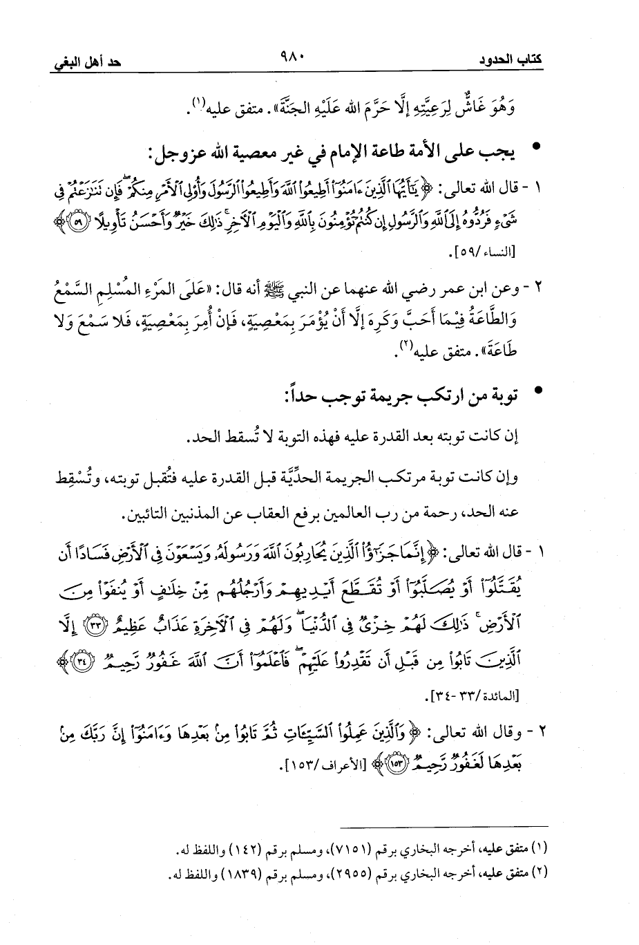 1 - قال الله تعالى: {إِنَّمَا جَزَاءُ الَّذِينَ يُحَارِبُونَ اللَّهَ وَرَسُولَهُ وَيَسْعَوْنَ فِي الْأَرْضِ فَسَادًا أَنْ يُقَتَّلُوا أَوْ يُصَلَّبُوا أَوْ تُقَطَّعَ أَيْدِيهِمْ وَأَرْجُلُهُمْ مِنْ خِلَافٍ أَوْ يُنْفَوْا مِنَ الْأَرْضِ ذَلِكَ لَهُمْ خِزْيٌ فِي الدُّنْيَا وَلَهُمْ فِي الْآخِرَةِ عَذَابٌ عَظِيمٌ (33) إِلَّا الَّذِينَ تَابُوا مِنْ قَبْلِ أَنْ تَقْدِرُوا عَلَيْهِمْ فَاعْلَمُوا أَنَّ اللَّهَ غَفُورٌ رَحِيمٌ (34)} [المائدة/33 - 34].