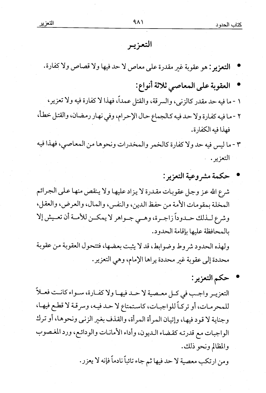 - التعزير: هو عقوبة غير مقدرة على معاص لا حد فيها ولا قصاص ولا كفارة.