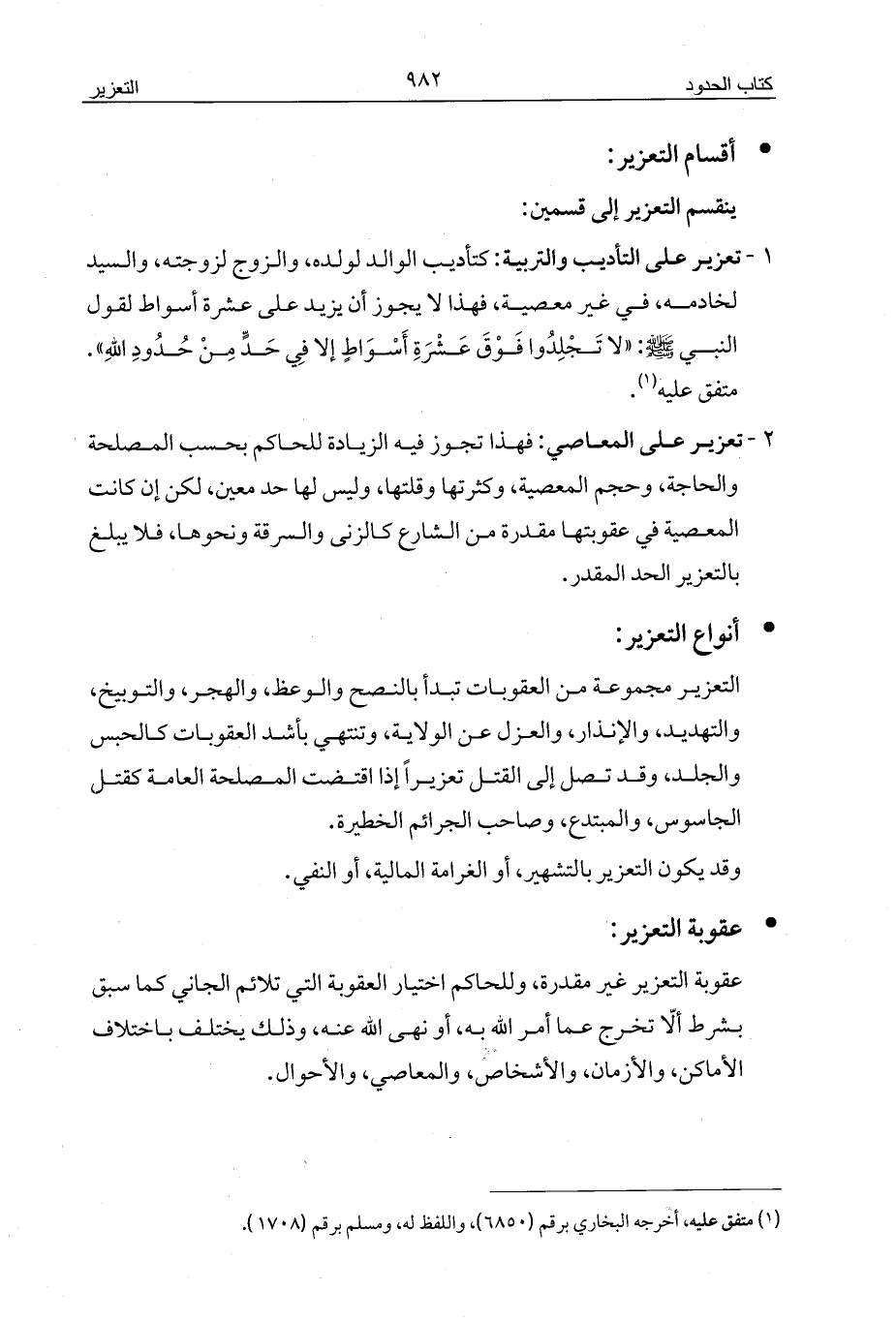 1 - تعزير على التأديب والتربية: كتأديب الوالد لولده، والزوج لزوجته، والسيد لخادمه، في غير معصية، فهذا لا يجوز أن يزيد على عشرة أسواط لقول النبي - صلى الله عليه وسلم -: «لا تَجْلِدُوا فَوْقَ عَشْرَةِ أَسْوَاطٍ إلا فِي حَدٍّ مِنْ حُدُودِ اللهِ».