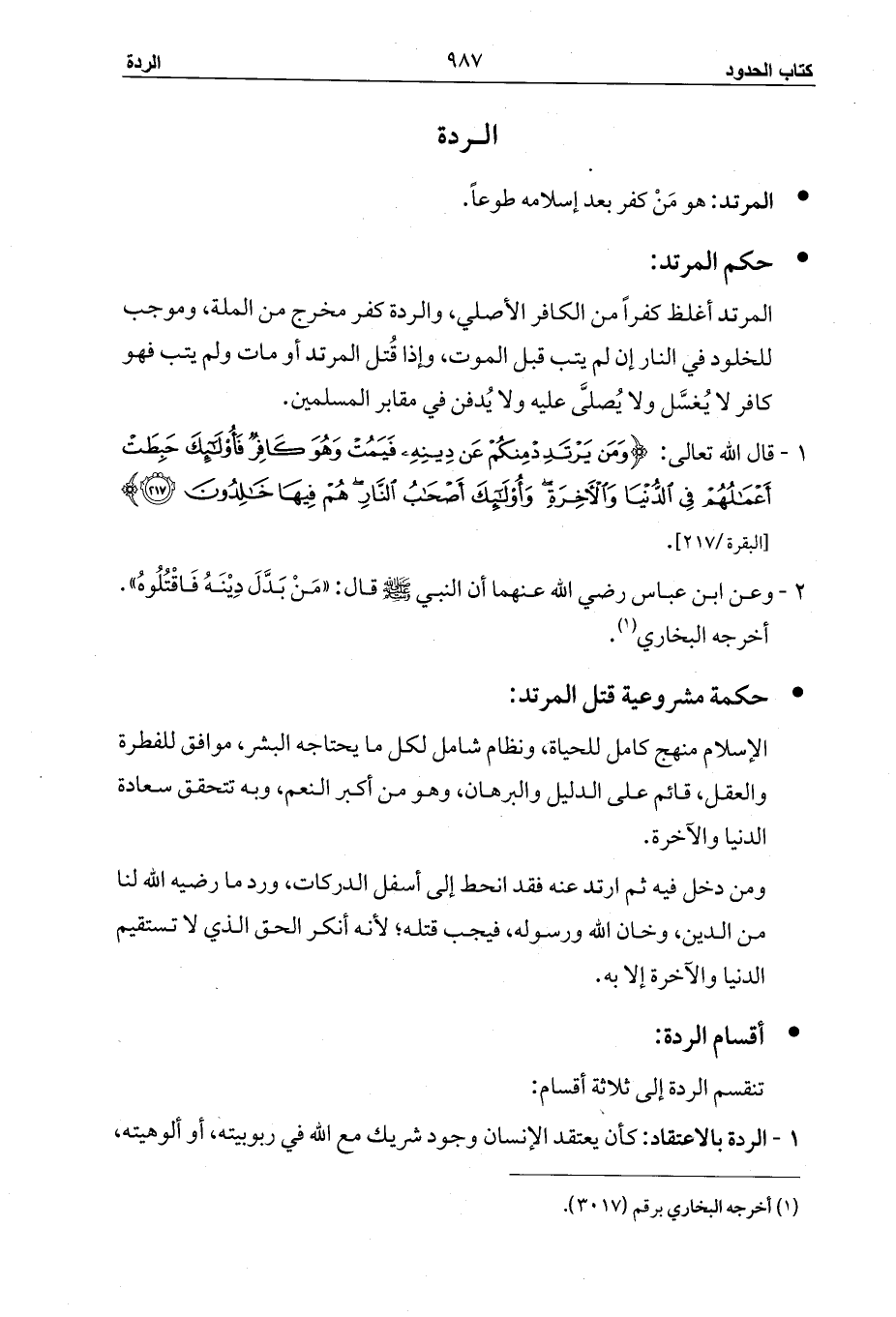 1 - قال الله تعالى: ... {وَمَنْ يَرْتَدِدْ مِنْكُمْ عَنْ دِينِهِ فَيَمُتْ وَهُوَ كَافِرٌ فَأُولَئِكَ حَبِطَتْ أَعْمَالُهُمْ فِي الدُّنْيَا وَالْآخِرَةِ وَأُولَئِكَ أَصْحَابُ النَّارِ هُمْ فِيهَا خَالِدُونَ (217)} [البقرة/217].