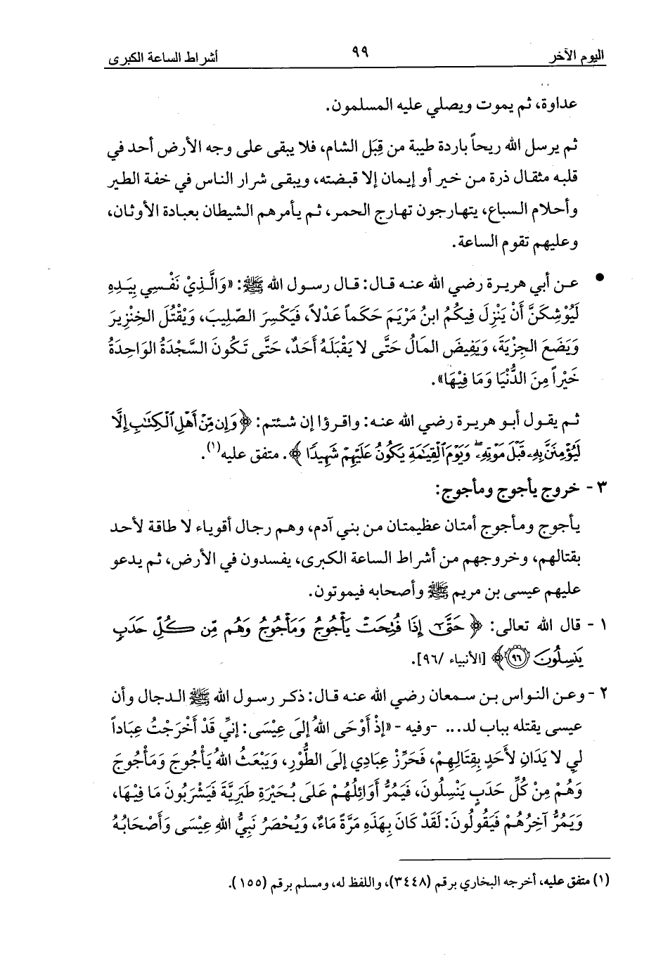 - عن أبي هريرة رضي الله عنه قال: قال رسول الله - صلى الله عليه وسلم -: «وَالَّذِيْ نَفْسِي بِيَدِهِ لَيُوْشِكَنَّ أَنْ يَنْزِلَ فِيكُمُ ابنُ مَرْيَمَ حَكَماً عَدْلاً، فَيَكْسِرَ الصّلِيبَ، وَيْقْتُلَ الخِنْزِيرَ وَيَضَعَ الجِزْيَةَ، وَيَفِيضَ المَالُ حَتَّى لا يَقْبَلَهُ أَحَدٌ، حَتَّى تَكُونَ السَّجْدَةُ الوَاحِدَةُ خَيْراً مِنَ الدُّنْيَا وَمَا فِيْهَا».