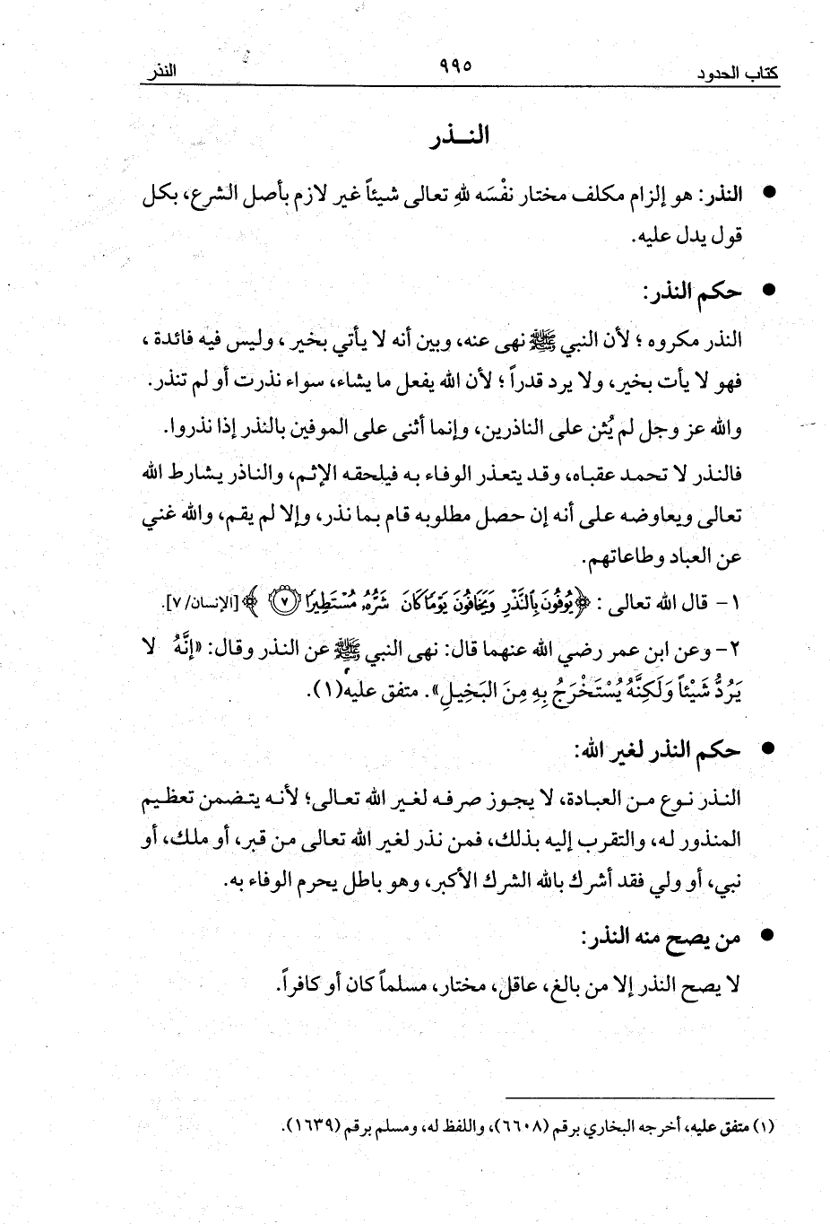 - النذر: هو إلزام مكلف مختار نفْسَه للهِ تعالى شيئاً غير لازم بأصل الشرع، بكل قول يدل عليه.
