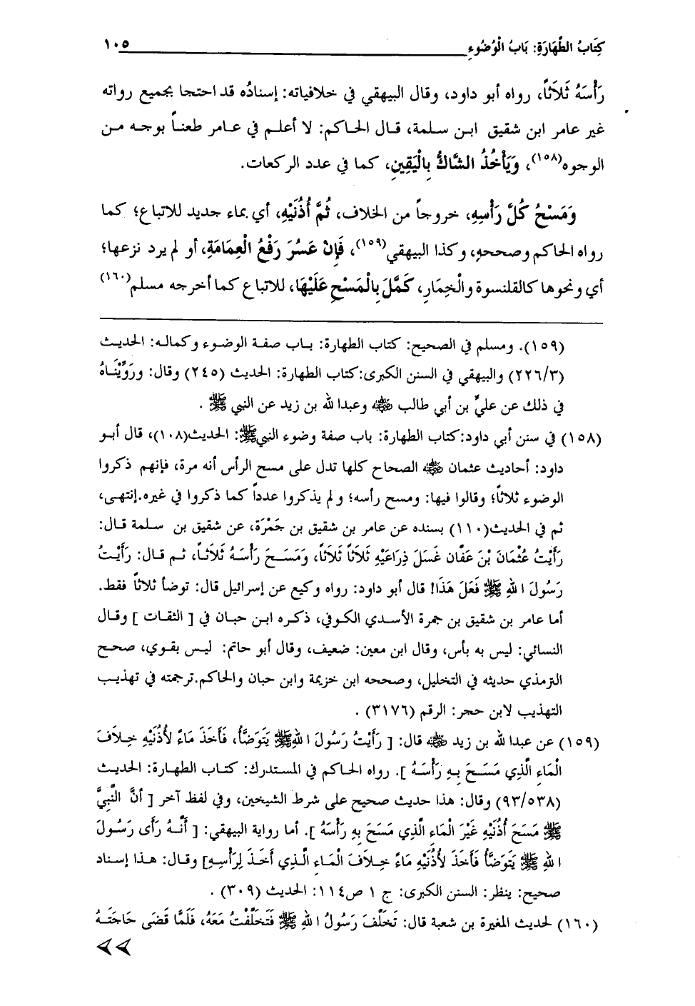(¬158) في سنى أبي داود: كتاب الطهارة: باب صفة وضوء النبي - صلى الله عليه وسلم -: الحديث (108)، قال أبو داود: أحاديث عثمان - رضي الله عنه - الصحاح كلها تدل على مسح الرأس أنه مرة، فإنهم ذكروا الوضوء ثلاثًا؛ وقالوا فيها: ومسح رأسه؛ ولم يذكروا عددًا كما ذكروا في غيره. إنتهى، ثم في الحديث (110) بسنده عن عامر بن شقيق بن جَمْرَة، عن شقيق بن سلمة قال: