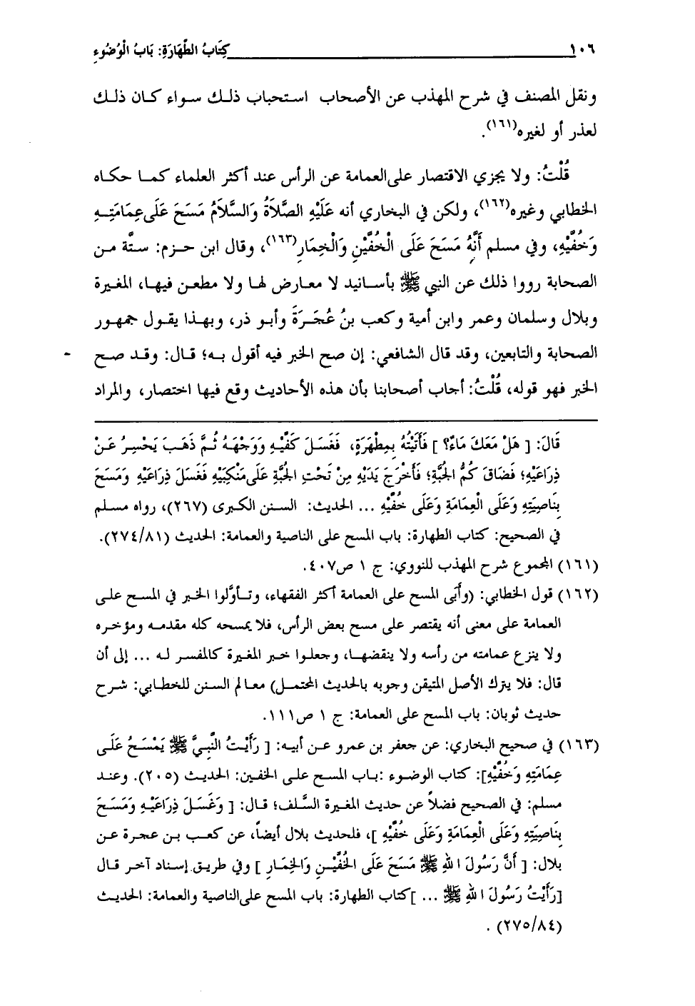 (¬162) قول الخطابي: (وأَبَى المسح على العمامة أكثر الفقهاء، وتأوَّلوا الخبر في المسح على العمامة على معنى أنه يقتصر على مسح بعض الرأس، فلا يمسحه كله مقدمه ومؤخره ولا ينزع عمامته من رأسه ولا ينقضها، وجعلوا خبر المغيرة كالمفسر له ... إلى أن قال: فلا يترك الأصل المتيقن وجوبه بالحديث المحتمل) معالم السنن للخطابى: شرح حديث ثوبان: باب المسح على العمامة: ج 1 ص 111.