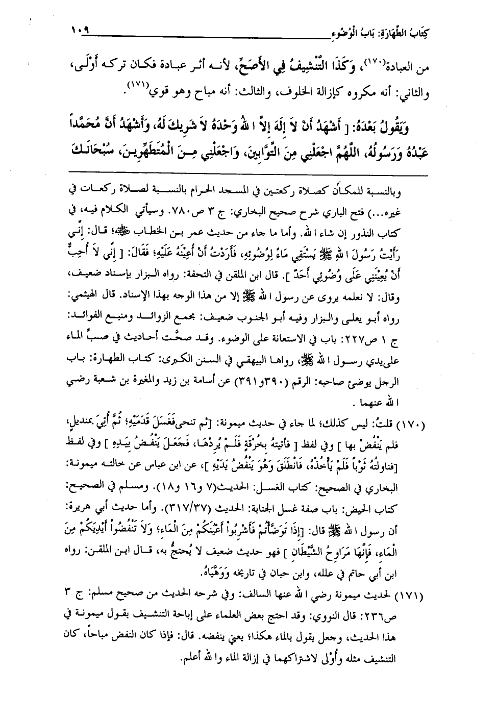 (¬171) لحديث ميمونة رضي الله عنها السالف: وفي شرحه الحديث من صحيح مسلم: ج 3 ص 236: قال النووى: وقد احتج بعض العلماء على إباحة التنشيف بقول ميمونة في هذا الحديث، وجعل يقول بالماء هكذا، يعني ينفضه. قال: فإذا كان النفض مباحًا، كان التنشيف مثله وأُوْلى لاشتراكهما في إزالة الماء والله أعلم.