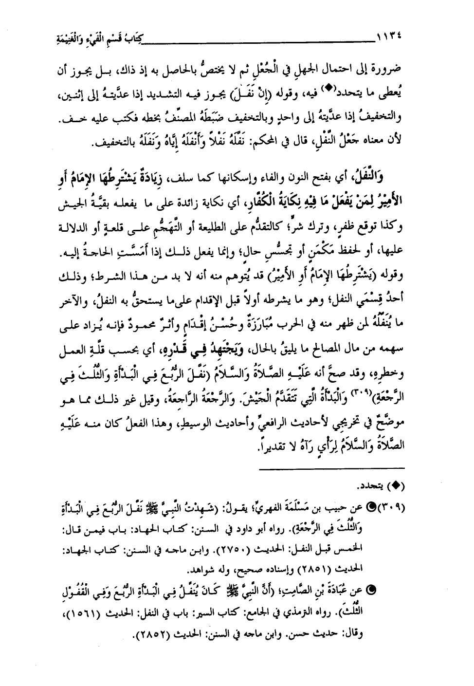 • عن عُبَادَةَ بْنِ الصَّامِتِ؛ (أَنَّ النَّبِيَّ - صلى الله عليه وسلم - كَانَ يُنَفِّلُ فِي الْبَدْأَةِ الرُّبُعَ وَفِى الْقُفُوْلِ الثُّلُثَ). رواه الترمذي في الجامع: كتاب السير: باب في النفل: الحديث (1561)، وقال: حديث حسن. وابن ماجه في السنن: الحديث (2852).