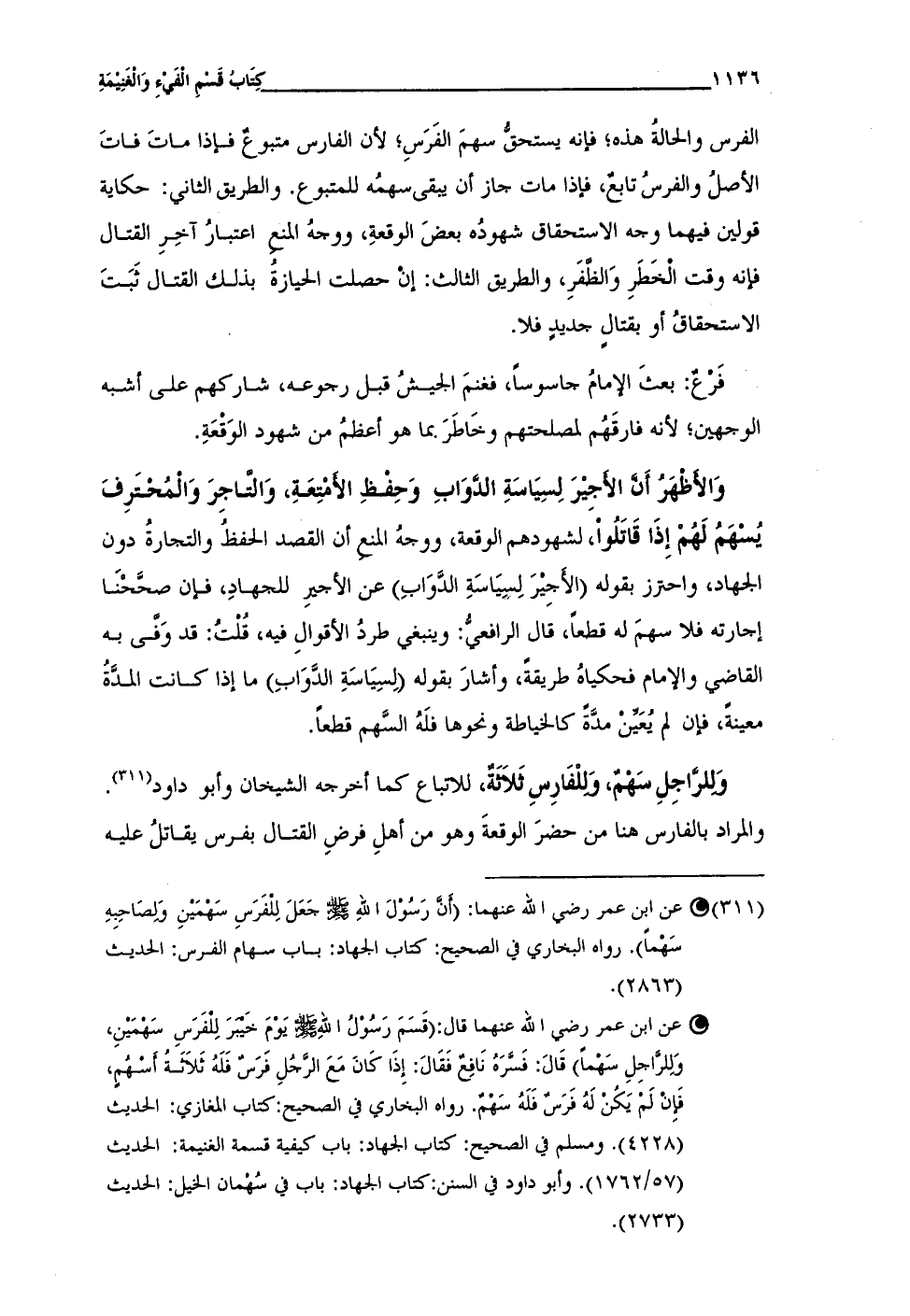 (¬311) • عن ابن عمر رضي الله عنهما: (أَنَّ رَسُوْلَ اللهِ - صلى الله عليه وسلم - جَعَلَ لِلْفَرَسِ سَهْمَيْنِ وَلِصَاحِبِهِ سَهْماً). رواه البخاري في الصحيح: كتاب الجهاد: باب سهام الفرس: الحديث (2863).