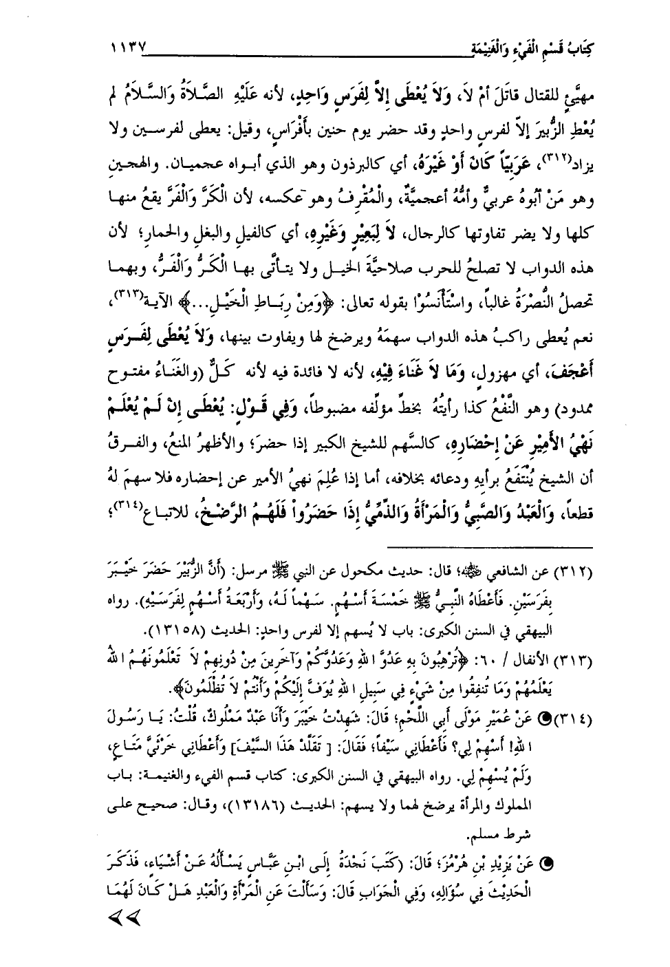(¬312) عن الشافعى - رضي الله عنه -؛ قال: حديث مكحول عن النبي - صلى الله عليه وسلم - مرسل: (أَنَّ الزُّبَيْرَ حَضَرَ خَيْبَرَ بِفرَسَيْنِ. فَأَعْطَاهُ النَّبِىُّ - صلى الله عليه وسلم - خَمْسَةَ أَسْهُمٍ. سَهْماً لَهُ، وَأَرْبَعَةُ أَسْهُمٍ لِفَرَسَيْهِ). رواه البيهقى في السنن الكبرى: باب لا يُسهم إلا لفرس واحدٍ: الحديث (13158).