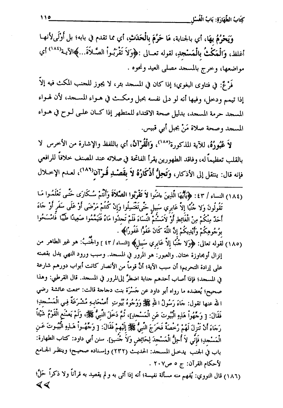 (¬185) لقوله تعالى: {وَلَا جُنُبًا إِلَّا عَابِرِي سَبِيلٍ} [النساء / 43] والجُنُبُ: هو غير الطاهر من إنزال أو مجاوزة ختان. والعبور: هو المَرور في المسجد. وسبب ورود النهي يدل بقصته على إرادة التحريم؛ أن سبب الآية؛ أنَّ قوماً من الأنصار كانت أبواب دورهم شارعة في المسجد؛ فإذا أصاب أحدهم جنابة اضطرَّ إلى المرور في المسجد. قال القرطبي: وهذا صحيح؛ يُعضده ما رواه أبو داود عن جَسْرَة بنت دحاجة قالت: سمعت عاشة رضي الله عنها تقول: جَاءَ رَسُولُ اللهِ - صلى الله عليه وسلم - وَوُجُوهُ بُيُوتِ أَصْحَابهِ مًشْرَعَةٌ فِي الْمَسْجِدِ، فَقَالَ: [وَجِّهُواْ هَذِهِ الْبُيُوت عَنِ الْمَسْجدِ]، ثُمَّ دَخَلَ النَّبِيُّ - صلى الله عليه وسلم -، وَلَمْ يَصْنَعِ الْقَوْمُ شَيْئاً رَجَاءَ أَنْ تَنْزِلَ لَهُمْ رُخصَةٌ فَخَرَجَ النَّبِيُّ - صلى الله عليه وسلم - إِلَيْهِمْ فَقَالَ: [وَجِّهُواْ هَذِهِ الْبُيُوتَ عَنِ الْمَسْجِدِ؛ فَإِنِّي لاَ أُحِلُّ الْمَسْجِدَ لِحَائِضٍ وَلاَ جُنُبٍ]. سنن أبي داود: كتاب الطهارة: باب في الجنب يدخل المسجد: الحديث (232) وإسناده صحيح؛ وينظر الجامع لأحكام القرآن: ج 5 ص 207.