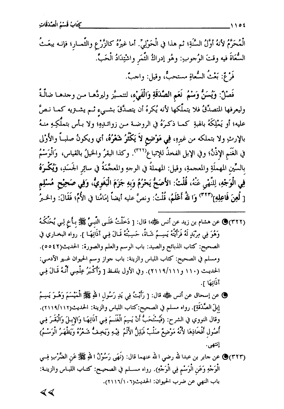 فَصْلٌ: ويسَنُّ وَسْمُ نَعَمِ الصَّدَقَةِ وَالْفَيءِ، لتتميَّز وليردَّها من وحدها ضالَّةً وليعرفها المتصدِّقُ فلا يتملَّكها لأنه يُكرهُ أن يتصدَّقَ بشئٍ ثم يشتريه كما نصَّ عليه؛ أو يَمْلِكَهُ بالهبةِ كما ذكرَهُ في الروضة من زوائدِهِ؛ ولا بأس بتملُّكِهِ منهُ بالإرثِ ولا بتملكه من غيرِهِ، في مَوْضِع لا يَكْثرُ شَعْرُهُ، أَيضًا ويكونُ صلبًا والأوْلى في الغَنَمِ الإذْنُ؛ وفي الإبل الفخذُ للإتباع (¬322). وكذا البقرُ والخيلُ بالقياس، وَالْوَسْمُ بِالسِّينِ المهملَةِ والمعجمةِ، وقيل: المهملةُ في الوجهِ والمعجَّمَةُ في سائِرِ الجَسَدِ، وَيُكْرَهُ في الْوَجْهِ، لِلنَّهْي عَنْهُ، قُلْتُ: الأَصَحُّ يَحْرُمُ وَبِهِ جَزَمَ الْبَغَوِي، وَفِي صَحِيْح مُسْلِمٍ [لُعِنَ فَاعِلِهِ] (¬323) وَالله أَعْلَمُ، قُلْتُ: ونصَّ عليه أَيضًا إِمَامُنا في الأُمِّ؛ فَقَالَ: والخبرُ