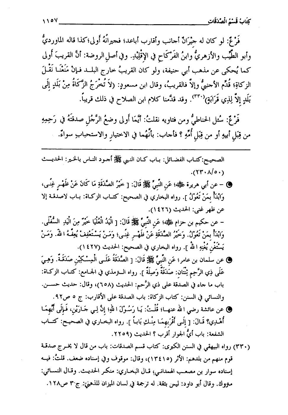 (¬330) رواه البيهقي في السنن الكبرى: كتاب قسم الصدقات: باب من قال لا يخرج صدقة قوم منهم من بلدهم: الأثر (13415)، وقال: موقوف وفي إسناده ضعف. قلتُ: فيه إسناده سوار بن مصعب الهمداني؛ قال البُخَارِيّ: منكر الحديث. وقال النَّسائيّ: متروك. وقال أبو داود: ليس بثقة. له ترجمة في لسان الميزان للذهبي: ج 3 ص 128.
