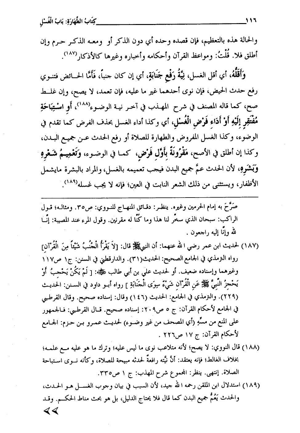(¬187) لحديث ابن عمر رضى الله عنهما: أن النبي - صلى الله عليه وسلم - قال: [لاَ يَقْرَأُ الْجُنُبُ شَيْئاً مِنَ الْقُرْآنِ] رواه الترمذى في الجامع الصحيح: الحديث (31). والدارقطني في السنن: ج 1 ص 117 وغيرهما وإسناده ضعيف. أو لحديث على بن أبي طالب - رضي الله عنه -: [لَمْ يَكُنْ يَحْجِبُ أَوْ يَحْجِزُ النَّبِيَّ - صلى الله عليه وسلم - عَنِ الْقُرْآنِ شَيْءٌ سِوَى الْجَنَابَةِ] رواه أبو داود في السنن: الحديث (229). والترمذي في الجامع: الحديث (146) وقال: إسناده صحيح. وقال القرطبي في الجامع لأحكام القرآن: ج 5 ص 209: إسناده صحيح. قال القرطبي: فالجمهور على المنع من مسِّهِ (أي المصحف من غير وضوء) لحديث عمرو بن حزم: الجامع لأحكام القرآن: ج 17 ص 226.