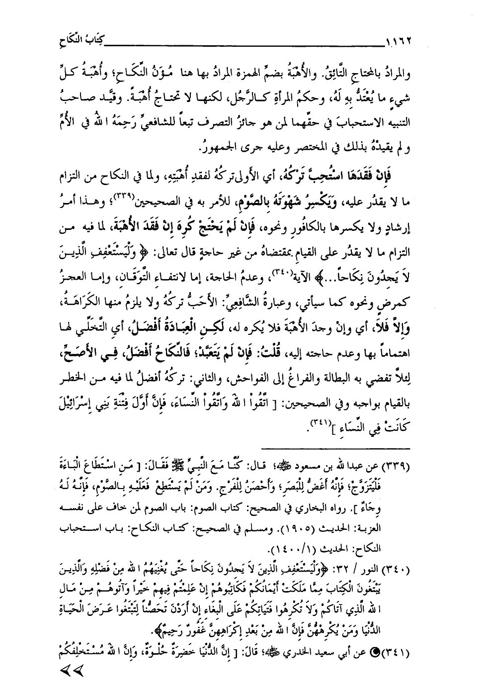 (¬339) عن عبد الله بن مسعود - رضي الله عنه -؛ قال: كنا مَعَ النبِيِّ - صلى الله عليه وسلم - فَقَالَ: [مَنِ اسْتَطَاعَ الْبَاءَةَ فَلْيَتَزَوَّجْ؛ فَإنَّهُ أَغَضُّ لِلْبَصَرِ؛ وَأَحْصَنُ لِلْفَرْجِ. وَمَنْ لَم يَسْتَطِعْ فَعَلَيْهِ بِالصَّوْمِ، فَإِنْهُ لَهُ وِجَاءٌ]. رواه البُخَارِيّ في الصحيح: كتاب الصوم: باب الصوم لمن خاف على نفسه العزبة: الحديث (1905). ومسلم في الصحيح: كتاب النكاح: باب استحباب النكاح: الحديث (1/ 1400).