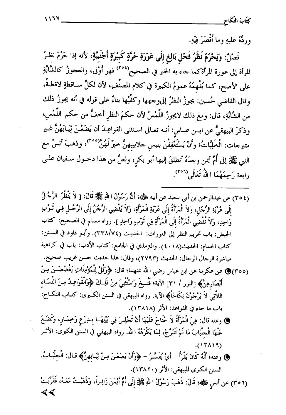 (¬355) عن عكرمة عن ابن عباس رضي الله عنهما؛ قال: {وَقُلْ لِلْمُؤْمِنَاتِ يَغْضُضْنَ مِنْ أَبْصَارِهِنَّ} [النور / 31] الآية؛ فَنُسِخَ وَاسْتُثْنِي مِنْ ذَلِكَ {وَالْقَوَاعِدُ مِنَ النِّسَاءِ اللَّاتِي لَا يَرْجُونَ نِكَاحًا} الآية. رواه البيهقي في السنن الكبرى: كتاب النكاح: باب ما جاء في القواعد: الأثر (13818).