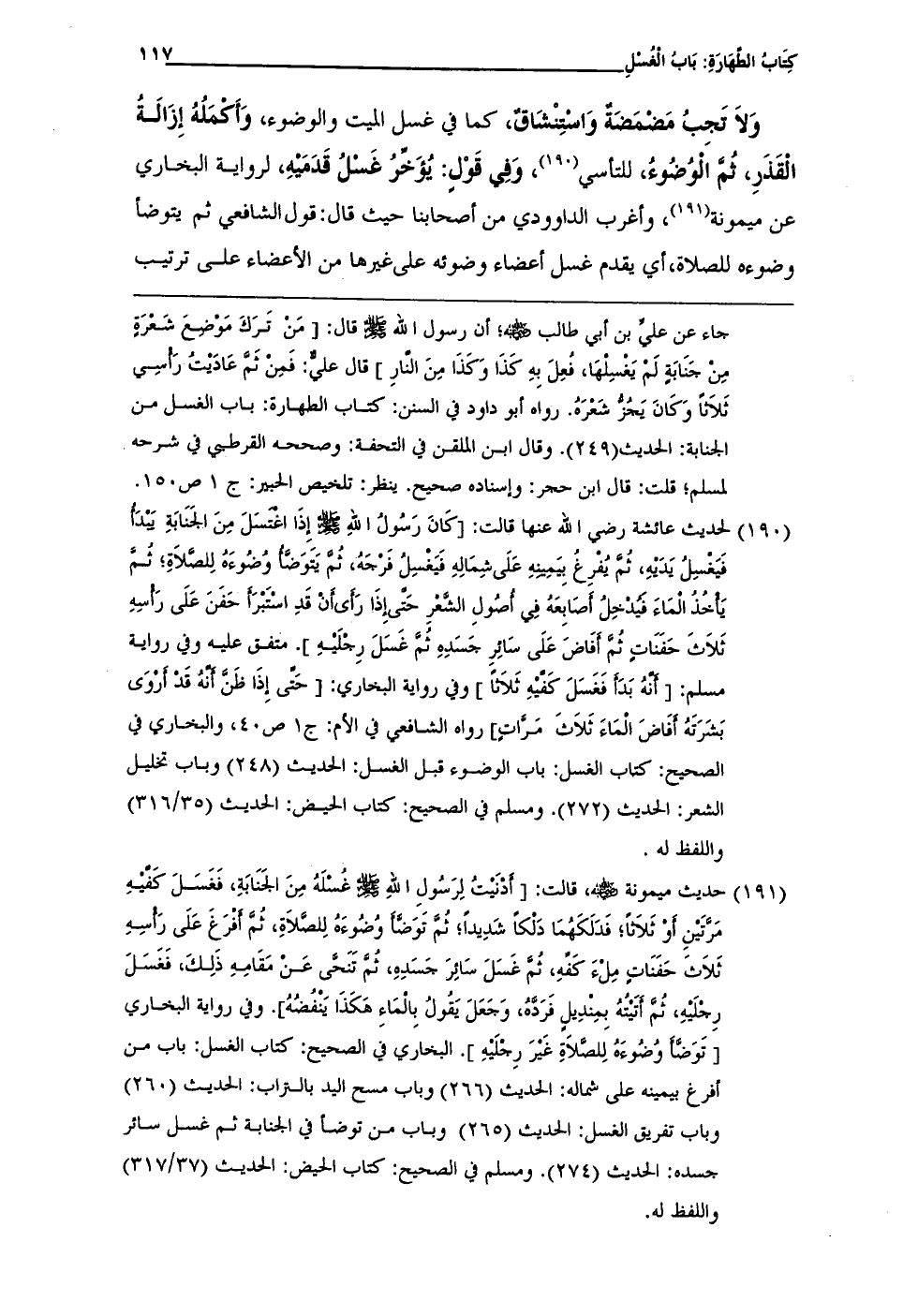 (¬190) لحديث عائشة رضي الله عنها قالت: [كَانَ رَسُولُ اللهِ - صلى الله عليه وسلم - إِذَا اغْتَسَلَ مِنَ الجَنَابَةِ يَبْدَأُ فَيَغْسِلُ يَدَيْهِ، ثُمَّ يُفرِغُ بِيَمِينِهِ عَلَى شِمَالِهِ فَيَغْسِلُ فَرْجَهُ، ثُمَّ يَتَوَضَّأُ وُضُوءَهُ لِلصَّلاَةِ؛ ثُمَّ