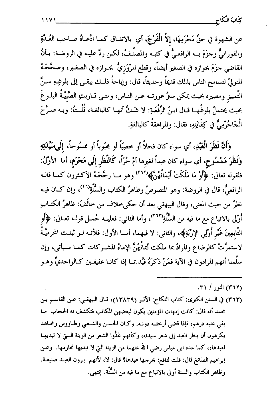 (¬363) في السنن الكبرى: كتاب النكاح: الأثر (13839)، قال البيهقي: عن القاسم بن محمَّد أنَّه قال: كانت أمهات المُؤمنين يكون لبعضهن المكاتب فتكشف له الحجاب ما بقي عليه درهم، فإذا قضى أرخته دونه. وكان الحسن والشعبي وطاووس ومجاهد يكرهون أن ينظر العبد إلى شعر سيدته، وكأنهم عَدُّوا الشعر من الزينة إلى لا تبديها لعبدها, كما عده ابن عباس رضي الله عنهما من الزينة إلى لا تبديها لمحارمها. وعن إبراهيم الصائغ قال: قلت لنافع: يحرجها عبدها؟ قال: لا, لأنهم يرون العبد صنيعة. وظاهر الكتاب والسنة أولى بالاتباع مع ما فيه من السُّنَّة. إنتهى.