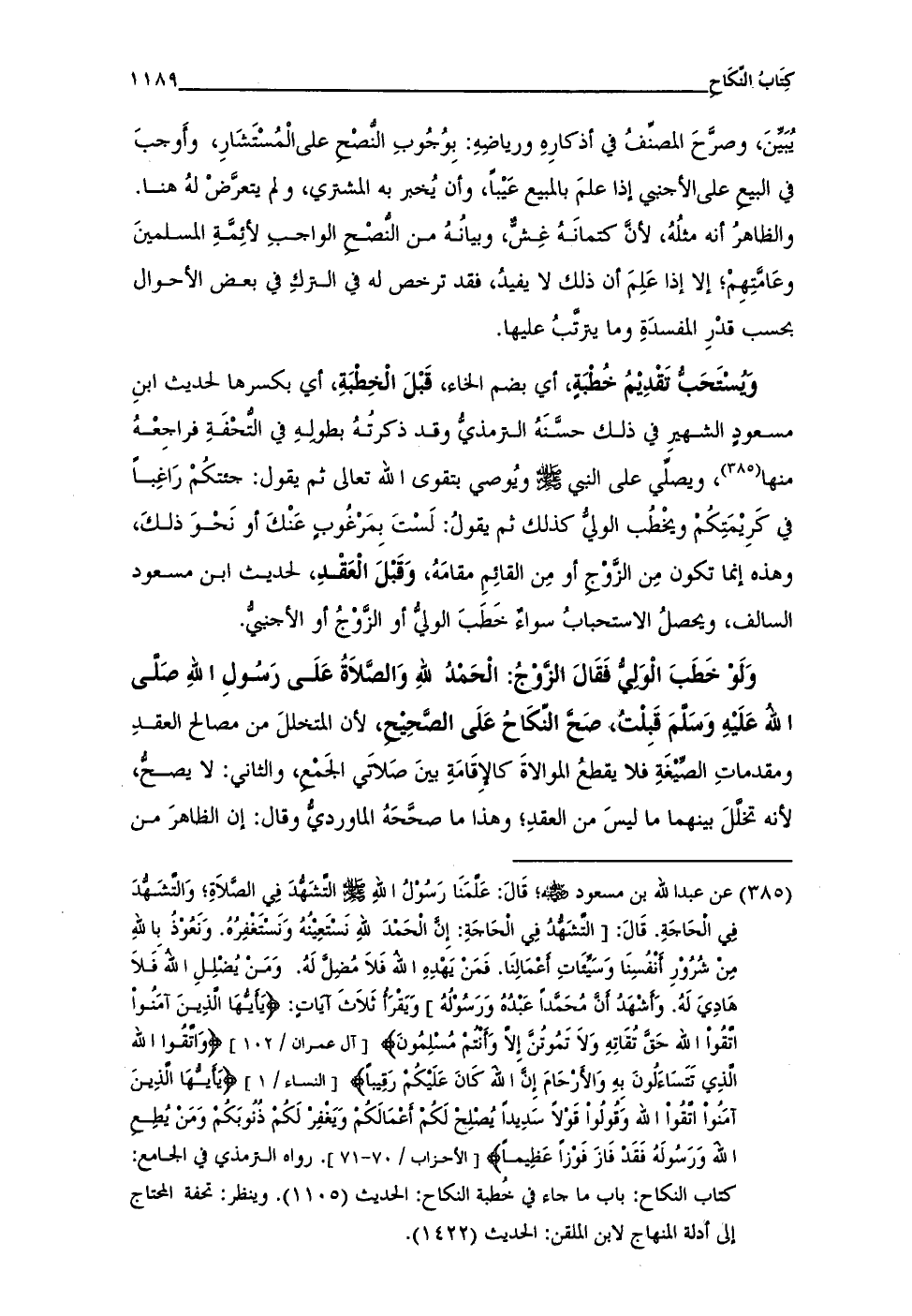 ويُسْتَحَبُّ تَقْدِيْمُ خُطْبَةٍ، أي بضم الخاء، قَبْلَ الْخِطْبَةِ، أي بكسرها لحديث ابنِ مسعودٍ الشهيرِ في ذلك حسَّنَهُ الترمذيُّ وقد ذكرتُهُ بطولهِ في التُّحْفَةِ فراجِعْهُ منها (¬385)، ويصلِّي على النبي - صلى الله عليه وسلم - ويُوصي بتقوى الله تعالى ثم يقول: جئتكُمْ رَاغِباً في كَرِيْمَتِكُمْ ويخْطُب الوليُّ كذلك ثم يقولُ: لَسْتَ بِمَرْغُوبٍ عَنْكَ أو نَحْوَ ذلكَ، وهذه إنما تكون مِن الزُّوْج أو مِن القائِمِ مقامَهُ، وَقَبْلَ الْعَقْدِ، لحديث ابن مسعود السالف، ويحصلُ الاستحبابُ سواءٌ خَطَبَ الوليُّ أو الزَّوْجُ أو الأجنبيُّ.