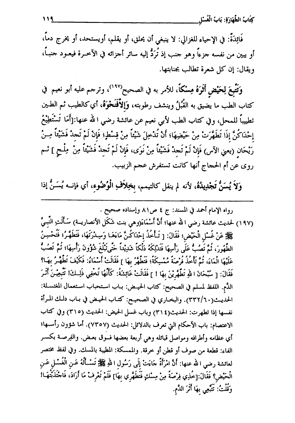 (¬197) لحديث عائشة رضى الله عنها؛ أنَّ أَسْمَاءَ (وهى بنت شَكَل الأنصارية) سَأَلَتِ النَّبِيَّ - صلى الله عليه وسلم - عَن غُسلِ الْحَيْضِ؛ فَقَالَ: [تَأْخُذُ إِحْدَاكُنَّ مَاءَهَا وَسِدْرَتَهَا، فَتَطَهَّرُ؛ فَتُحْسِنُ الطهُورَ، ثُمَّ تَصُب عَلَى رَأسِهَا فَتَدْلِكَهُ دَلْكاً شَدِيْداً حَتَّى تَبْلُغَ شُؤُونَ رَأْسِهَا؛ ثُمَّ تَصُبُّ عَلَيْهَا الْمَاءَ، ثُمَّ تَأْخُذُ فُرْصَةً مُمْسِكَةً؛ فَتَطَّهَّرُ بِهَا] فَقَالَتْ أَسْمَاءُ: فَكَيْفَ تَطَّهَّرُ بهَا؟ فَقَالَ: [سُبْحَانَ اللهِ تَطّهَّرِيْنَ بِهَا! ] فَقَالَتْ عَائِشةُ: كَأَنَّهُا تُخْفِي ذَلِكَ! تَتّبِعِيْنَ أَثَرَ الدَّمِ. اللفظ لمسلم في الصحيح: كتاب الحيض: باب استحباب استعمال المغتسلة: الحديث (60/ 332). والبخاري في الصحيح: كتاب الحيض في باب دلك المرأة نفسها إذا تطهرت: الحديث (314) وباب غسل الحيض: الحديث (315) وفي كتاب