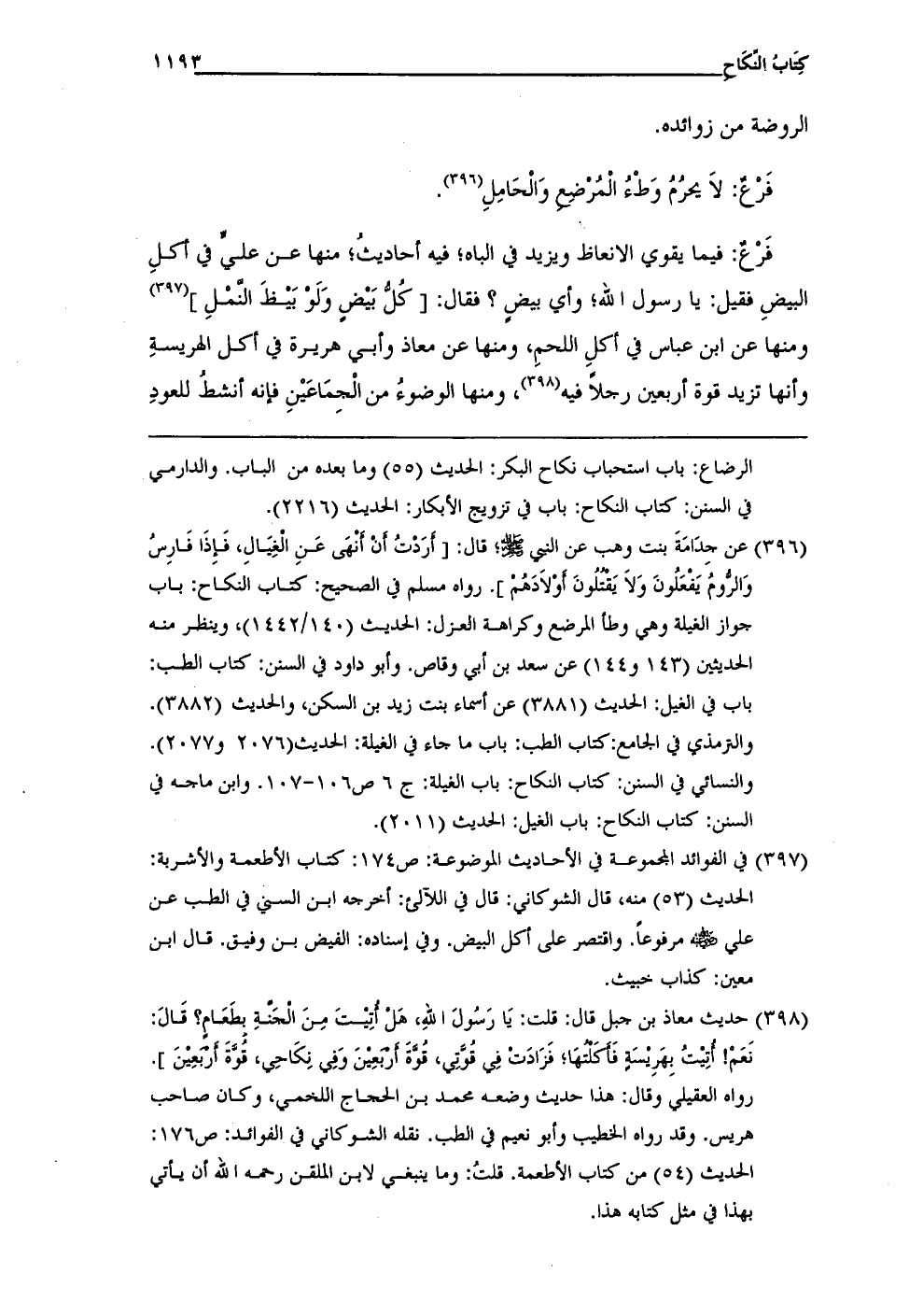 (¬396) عن جدَامَةَ بنت وهب عن النبي - صلى الله عليه وسلم -؛ قال: [أرَدتُ أن أنهى عَنِ الغِيَالِ، فإذَا فَارِسُ وَالرُّومُ يَفْعَلونَ وَلاَ يَقتلُونَ أوْلاَدَهُم]. رواه مسلم في الصحيح: كتاب النكَاح: باب جواز الغيلة وهى وطأ المرضع وكراهة العزل: الحديث (140/ 1442)، وينظر منه الحديثين (143 و 144) عن سعد بن أبي وقاص. وأبو داود في السنن: كتاب الطب: باب في الغيل: الحديث (3881) عن أسماء بنت زيد بن السكن، والحديث (3882). والترمذي في الجامع: كتاب الطب: باب ما جاء في الغيلة: الحديث (2076 و 2077). والنسائي في السنن: كتاب النكاح: باب الغيلة: ج 6 ص 106 - 107. وابن ماجه في السنن: كتاب النكاح: باب الغيل: الحديث (2011).