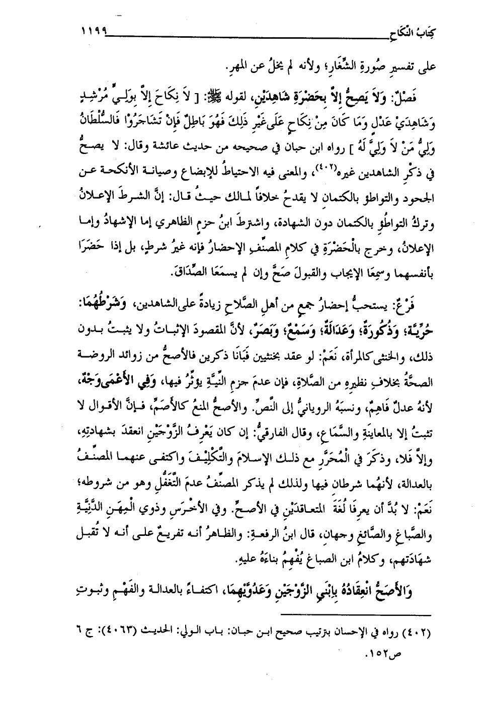 فَصلٌ: وَلاَ يَصِحُّ إِلَّا بِحَضْرَةِ شَاهِدَينِ، لقوله - صلى الله عليه وسلم -: [لاَ نِكَاحَ إِلَّا بِوليٍّ مُرشِدٍ وَشَاهِدَيْ عَدلٍ وَمَا كَانَ مِنْ نِكَاح عَلَى غَيْرِ ذَلِكَ فَهُرَ بَاطل فَكانْ تَشَاجَرُوْا فَالسلْطَانُ وَلِىُّ مَنْ لاَ وَلِىَّ له]، رواه ابن حبان في صحيحه من حديث عائشة وقال: لا يصحُّ في ذكْرِ الشاهدين غيره (¬402)، والمعنى فيه الاحتياط للإبضاع وصيانة الأنكحة عن الجحود والتواطؤ بالكتمانِ لا يقدحُ خلافاً لمالك حيث قال: إنَّ الشرطَ الإعلانُ وتركُ التواطُؤِ بالكتمان دون الشهادة، واشترطَ ابنُ حزمٍ الظاهري إما الإشهادُ وإما الإعلان، وخرج بالحَضرَةِ في كلامِ المصنف الإحضارُ نأنَّه غيرُ شرطٍ، بل إذا حَضَرَا بأنفسهما وسمِعَا الإيجاب والقبولَ صَحَّ وإن لم يسمَعَا الصدَاقَ.