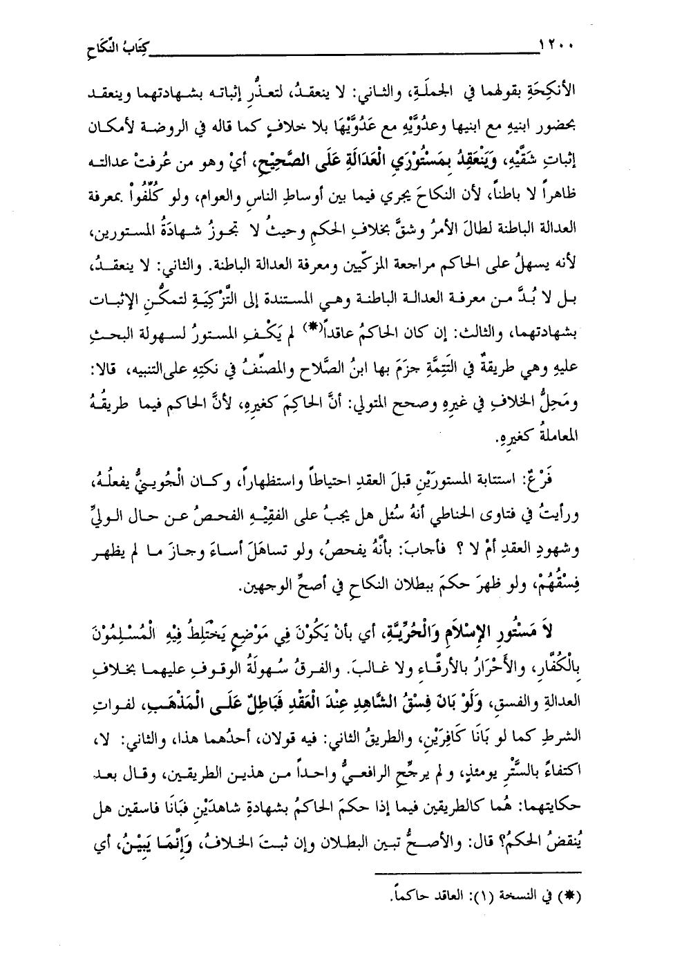 الأنكِحَةِ بقولهما في الجملَةِ، والثانى: لا ينعقدُ، لتعذُّرِ إثباته بشهادتهما وينعقد بحضور ابنيهِ مع ابنيها وعدُوَّيْهِ مع عَدُوَّيها بلا خلافٍ كما قاله في الروضة لأمكان إثباتِ شَقيْهِ، وَينْعَقِدُ بِمَسْتُوْرَيِ الْعَدَالَةِ عَلَى الصحِيْح، أيْ وهو من عُرفتْ عدالته ظاهراً لا باطناً، لأن النكاحَ يجري فيما بين أوساطِ الناسِ والعوام، ولو كُلِّفُوا بمعرفة العدالة الباطنة لطالَ الأمرُ وشقَّ بخلافِ الحكمِ وحيثُ لا تجوزُ شهادَةُ المستورين، لأنه يسهلُ على الحاكم مراجعة المزكّيين ومعرفة العدالة الباطنة. والثانى: لا ينعقدُ، بل لا بدَّ من معرفة العدالة الباطنة وهى المستندة إلى التَّزكِيَةِ لتمكُّنِ الإثبات بشهادتهما، والثالث: إن كان الحاكمُ عاقداً (•) لم يَكْفي المستورُ لسهولة البحثِ عليهِ وهى طريقةٌ في التَّتِمَّةِ جزَمَ بها ابنُ الصَّلاح والمصنّفُ فِى نكتِهِ على التنبيه، قال: ومَحِل الخلافِ في غيرِهِ وصحح المتولي: أنَّ الحاكِمَ كغيرِهِ، لأنَّ الحاكم فيما طريقُهُ المعاملةُ كغيرِهِ.