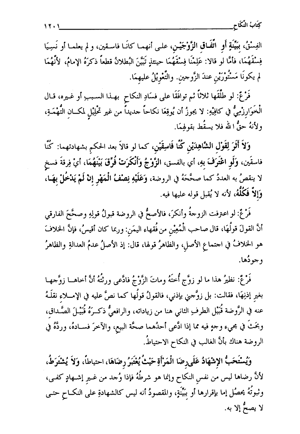 فَرْعٌ: لو اعترفت الزوجةُ وأنكرَ، فالأصحُّ في الروضة قبولُ قولهِ وصحَّحَ الفارقي أنَّ القولَ قولُها، قال صاحب الْمُعِيْنِ من فُقهاء اليمَنِ: وربما كان أقيسُ، فإنَّ الخلافَ هو الخلافُ في اجتماع الأصلِ، والظاهرُ قولها، قال: إذ الأصلُ عدمُ العدالةِ والظاهرُ وجودُها.