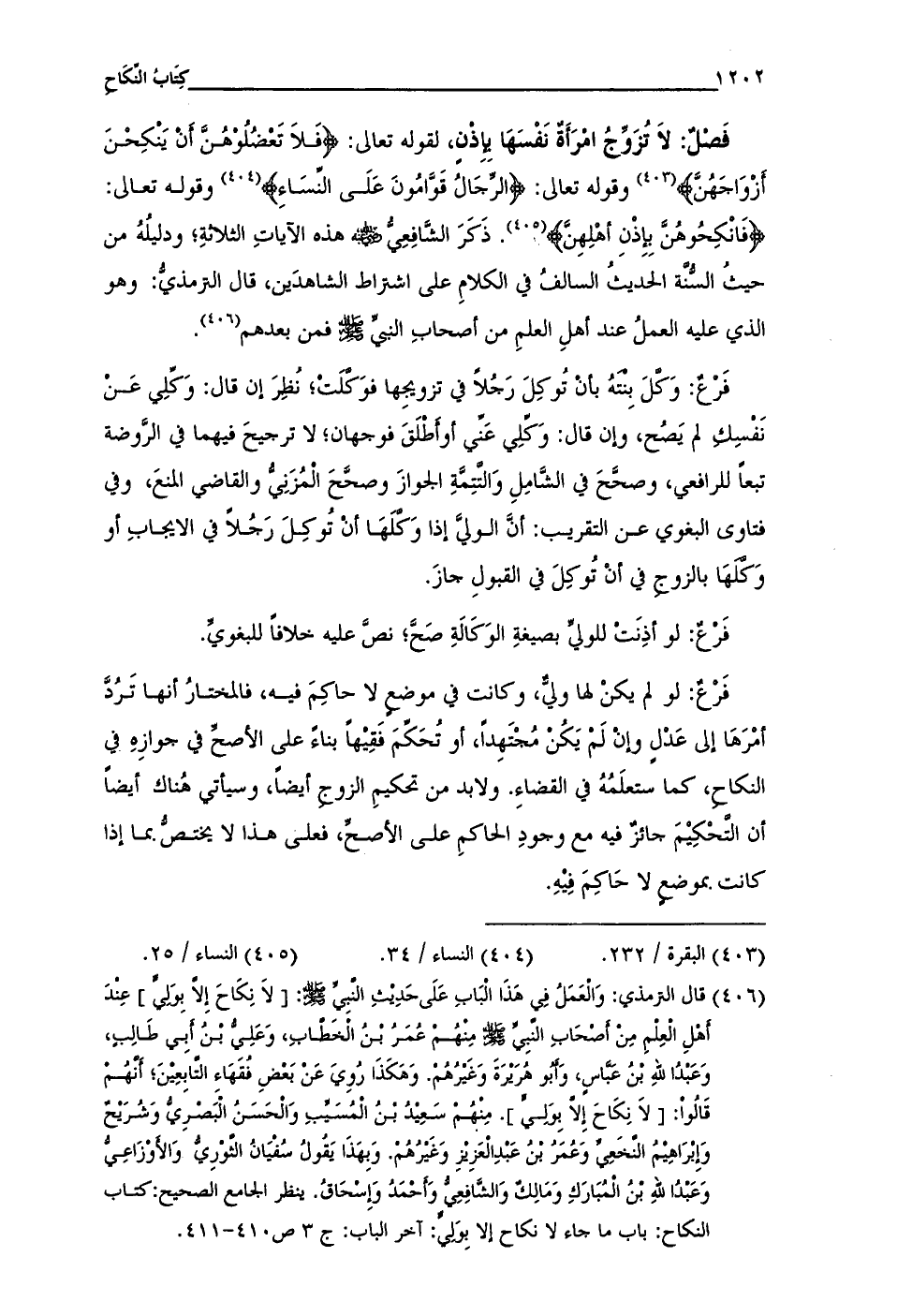 (¬406) قال الترمذي: وَالعَمَلُ فِى هَذَا البَابِ عَلَى حَدِيثِ النبِى - صلى الله عليه وسلم -: [لاَ نِكَاحَ إِلا بوَليّ] عِنْدَ أهلِ العِلمِ مِنْ أصحَابِ النبِي - صلى الله عليه وسلم - مِنْهُم عُمَرُ بن الخَطابِ، وَعَلِى بن أبى طَالِبٍ، وَعَبدُ اللهِ بن عباسٍ، وَأبو هُرَيرَةَ وغَيرُهُم. وَهَكَذَا رُوِىَ عَنْ بَعْضِ فُقَهَاءِ التابَعِيْنَ؛ أنْهُمْ قَالُوا: [لاَ نِكَاحَ إِلَّا بِوَليٍّ]. مِنهُمْ سَعِيدُ بنُ المُسَيِّبِ وَالحَسَنُ البَصريُّ وَشُرَيحٌ وَإِبرَاهِيْمُ النخَعِيّ وَعُمَرُ بن عَبْدِ العَزِيزِ وَغَيرُهُمْ. وَبِهَذَا يَقولُ سُفْيَانُ الثورِي وَالأوْزَاعِيُّ وَعَبدُ اللهِ بن المُبَارَكِ وَمالكٌ وَالشَّافِعِي وَأحْمَدُ وَإِسحَاقُ. ينظر الجامع الصحيح: كتاب النكاح: باب ما جاء لا نكاح إلا بِوَليّ: آخر الباب: ج 3 ص 410 - 411.
