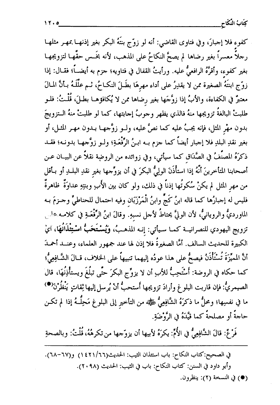 كفوءٍ فلا إجبارَ، وفي فتاوى القاضى: أنه لو زوّج بنتَهُ البكر بغير إذنها بمهر مثلها رجلًا معسرًا بغير رضاها لم يصحَّ النكاحُ على المذهب، لأنه بخَس حقَّها لتزويجها بغير كفوءٍ، وأقرَّهُ الرافعيُّ عليه. ورأيتُ القفال في فتاويه؛ جزم به أيضًا؛ فقال: إذا زوّج ابنتَهُ الصغيرة ممن لا يقدِرُ على أداء مهرِهَا بطَلَ النكاحُ، ثم علَّلَهُ بأنَّ المالَ معتبرٌ في الكفاءة، والأبُ إذا زوَّجَها بغير رِضاها ممن لا يُكافؤها بطلَ، قُلْتُ: فلو طلبتْ البالغة تزويجها منهُ فالذي يظهر وجوبُ إجابتها، كما لو طلبتْ منهُ التزويجَ بدون مهْرِ المثل، فإنه يجبُ عليه كما نصَّ عليه، ولو زوَّجها بدون مهر المثل، أو بغير نقدِ البلدِ فلا إجبار أيضًا كما جزم به ابنُ الرِّفْعَةِ؛ ولو زوجها بدونه، فقد ذكرَهُ المصنِّفُ في الصَّدَاقِ كما سيأتي, وفي زوائده من الروضة نقلًا عن البيان عن أصحابنا المتأخرينَ أنهُ إذا استأذَنَ الوليُّ البكرَ فِي أن يزوِّجها بغيرِ نقدِ البلدِ أو بأقل من مهرِ المثل لم يكنْ سُكوتُها إذنًا في ذلك، ولو كان بين الأبِ وبنتِهِ عداوَةْ ظاهرةٌ فليس له إجبارُها كما قاله ابنُ كَجٍّ وابنُ الْمَرزبَانِ وفيه احتمال للحناطيِّ وجزمَ به الماوردي والروياني، لأن الوليَّ يحتاط لأجل نسبِهِ. وقالَ ابنُ الرِّقْعَةِ في كلامه على تزويج اليهودي للنصرانية كما سيأتى: إِنه المذهبُ، ويستحَبُّ اسْتِئْذَانُهَا، أي الكبيرة للحديث السالف. أمَّا الصغيرة فلا إذن لها عند جمهور العلماء، وعند أحمدَ أن المميِّزَةَ تُسْتَأذَنُ فيصحُّ على هذا عودُه إليهما تنبيهًا على الخلاف، قالَ الشَّافِعِي؛ كما حكاه في الروضة: أَسْتَحِبُّ للأبِ أن لا يزوِّج البكرَ حتى تبلُغَ ويستأذِنُهَا، قال الصيمريُّ: فإن قاربت البلوغ وأرادَ تزويجها أَستحبُّ أنْ يُرسل إليها ثِقاب يَنْظرنَ (•) ما في نفسِها؛ ومحلُّ ما ذكرَهُ الشَّافِعِيُّ - رضي الله عنه - من التأخيرِ إلى البلوغ مَحِلُّهُ إذا لم تكن حاجةً أو مصلحةً كما قيَّدَهُ في الروضَةِ.