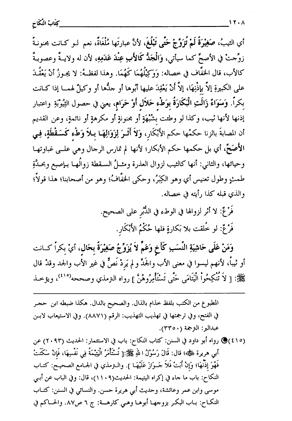 وَمَنْ عَلَى حَاشِيَةِ النّسَبِ كَأَخٍ وَعَمٍّ لاَ يُزَوِّجُ صَغِيْرَة بِحَالٍ، أيْ بِكرًا كانت أو ثيبًا، لأنهم ليسوا في معنى الأب والجَدِّ ولم يَرِدْ نَصٌّ في غير الأب والجد وقدْ قال - صلى الله عليه وسلم -: [لاَ تُنْكِحُوا الْيَتَامَى حَتى تَسْتَأمِرُوهُنَّ، رواه الترمذي وصححه (¬415)، ويؤخذ