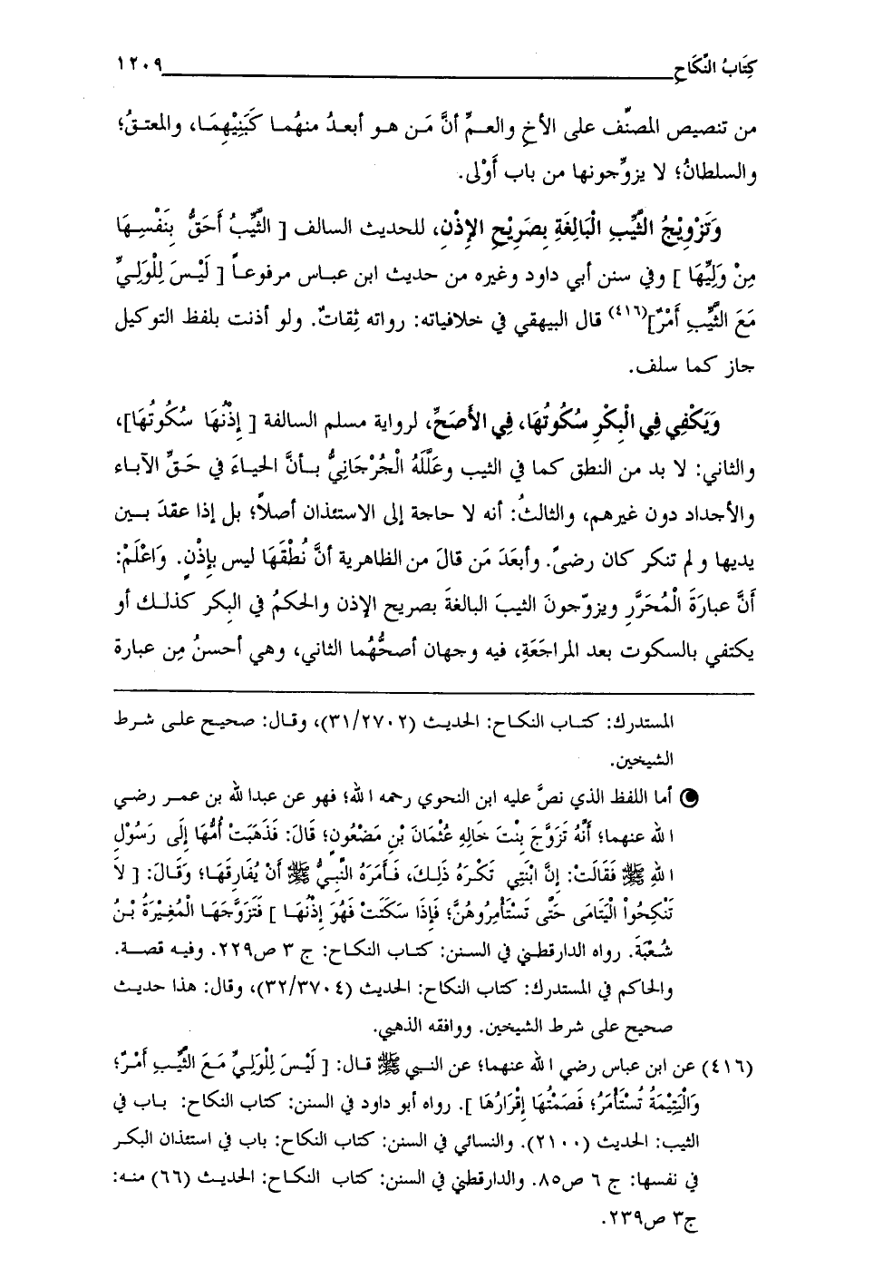 (¬416) عن ابن عباس رضي الله عنهما، عن النبي - صلى الله عليه وسلم - قال: [لَيسَ لِلْوَليِّ مَعَ الثيبِ أمرٌ؛ وَاليتِيمَةُ تُستَأمَرُ؛ فَصَمْتُهَا إِقرَارُهَا]. رواه أبو داود في السنن: كتاب النكاح: باب في الثيب: الحديث (2100). والنسائى في السنن: كتاب النكاح: باب في استئذان البكر في نفسها: ج 6 ص 85. والدارقطني في السنن: كتاب النكاح: الحديث (66) منه: ج 3 ص 239.