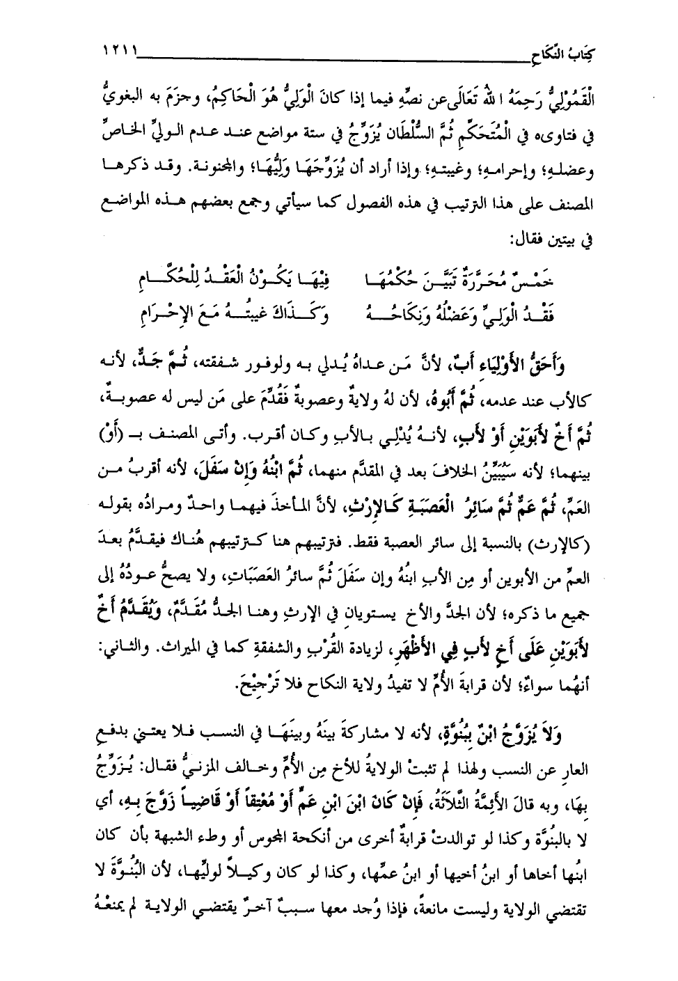 الْقَمُولِيُّ رَحِمَهُ الله تَعَالَى عن نصِّهِ فيما إذا كانَ الْوَلِيُّ هُوَ الْحَاكِمُ، وجزَمَ به البغويُّ في فتاوى في الْمُتَحَكِّمِ ثُمَّ السُّلْطَان يُزَوِّج في ستة مواضع عند عدم الوليِّ الخاصِّ وعضلهِ؛ وإحرامهِ؛ وغيبتهِ؛ وإذا أراد أن يُزَوِّجَهَا وَلِيُّهَا؛ والمجنونة. وقد ذكرها المصنف على هذا الترتيب في هذه الفصول كما سيأتي وجمع بعضهم هذه المواضع في بيتين فقال: