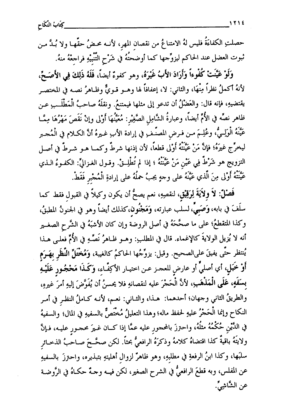 فَصْلٌ: لاَ وِلاَيَةَ لِرَقِيْقٍ، لنقصِهِ، نعم يصحُّ أن يكون وكيلاً في القبولِ فقط كما سلَفَ فِى بابه، وَصَبِيٍّ، لسلب عبارته، وَمَجْنُونٍ، كذلك أيضًا وهو في الجنونُ المطبقُ، وكذا المتقطعُ؛ على ما صحَّحَهُ في أصل الروضة وإن كان الأشبَهُ في الشَّرحِ الصغير أنه لا يُزيل الولايةَ كالإغماء. قال في المطلبِ: وهو ظاهرُ نَصِّهِ في الأُمِّ فعلى هذا يُنتظر حتَّى يفيقَ على الصحيح. وقيل: يزوجها الحاكمُ كالغيبة، وَمُخْتَلِّ النَّظَرِ بِهَرَمٍ أَوْ خَبَلٍ، أي أصليٍّ أو عارضٍ للعجز عن اختيار الأكِفَّاءِ، وَكَذَا مَحْجُورٍ عَليْهِ بِسَفَهٍ، عَلَى المَذْهَبِ، لأنَّ الْحَجْرَ عليه لنقصانهِ فلا يحسنُ أن يُفَوَّضَ إليهِ أمرَ غيرهِ، والطريقُ الثانى وجهان؛ أحدهما: هذا، والثاني: نعم، لأنه كاملُ النظرِ في أمر النكاح وإنما الْحَجْرُ عليهِ لحفظ ماله؛ وهذا التعليلُ مُخْتَصٌّ بالسفيهِ في المال؛ والسفيهُ في الدَّيْنِ حُكْمُهُ مثلُهُ، واحترزَ بالمحجورِ عليه عمَّا إذا كان غرَ محجورٍ عليه، فإنَّ ولايتَهُ باقيةَ كذا اقتضاهُ كلامهُ وذكرَهُ الرافعيُّ بحثاً. لكن صحَّحَ صاحبُ الذخائرِ سلبَها، وكذا ابنُ الرفعةِ فِى مطلبِهِ، وهو ظاهرٌ لزوالِ أهليتهِ بتبذيره، واحترزَ بالسفيهِ عن المفلس، وبه قطعَ الرافعيُّ في الشرح الصغير، لكن فيه وجهٌ حكاهُ في الرَّوضة عن الشَّاشِيِّ.