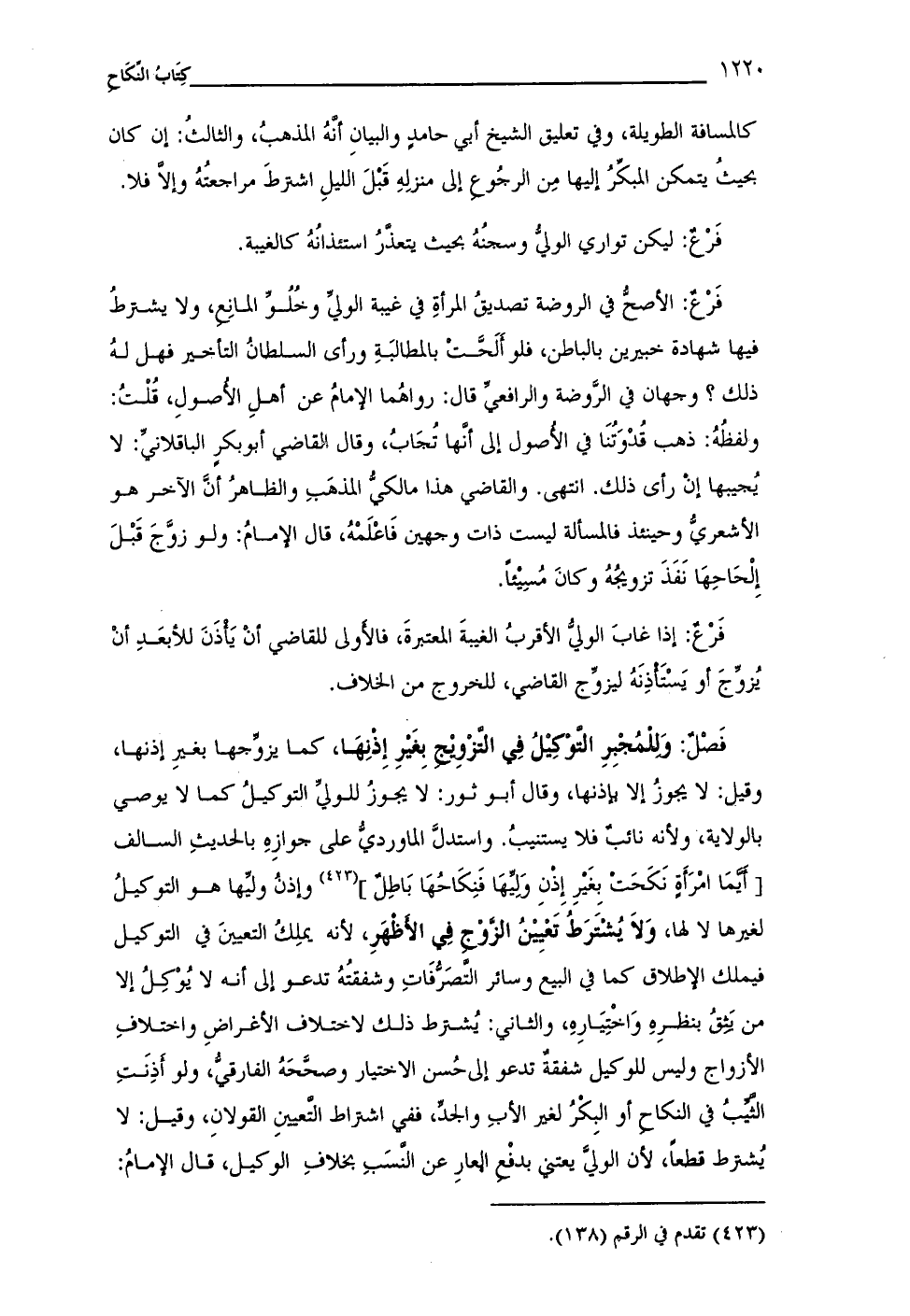 فَرْعٌ: الأصحُّ في الروضة تصديقُ المرأةِ في غيبة الوليِّ وخُلُوِّ المانِع، ولا يشترطُ فيها شهادة خبيرين بالباطن، فلو أَلَحَّتْ بالمطالبَةِ ورأى السلطانُ التأخير فهل لهُ ذلك؟ وجهان في الرَّوضة والرافعيِّ قال: رواهُما الإمامُ عن أهلِ الأُصولِ، قُلْتُ: ولفظُهُ: ذهب قُدْوَتُنَا في الأُصول إلى أنَّها تُجَابُ، وقال القاضي أبو بكر الباقلانيِّ: لا يُجيبها إنْ رأى ذلك. انتهى. والقاضي هذا مالكيُّ المذهَبِ والظاهرُ أنَّ الآخر هو الأشعريُّ وحينئذ فالمسألة ليست ذات وجهين فَاعْلَمْهُ، قال الإمامُ: ولو زوَّجَ قَبْلَ إِلْحَاحِهَا نَفَذَ تزويجُهُ وكانَ مُسِيْئًا.