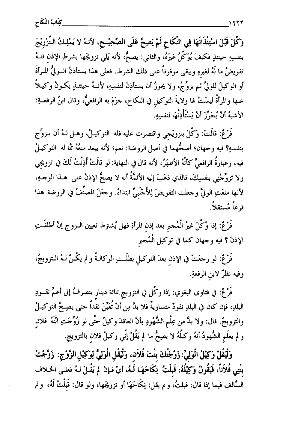 فَرْعٌ: قالَتْ: وَكّلْ بتزويْجِى واقتصرت عليه فله التوكيلُ، وهل لهُ أن يزوِّج بنفسهِ؟ فيه وجهان؛ أصحُّهما في أصل الروضة: نعم؛ لأنه يبعد منعُهُ ممَّا له التوكيلُ فيه، وعبارةُ الرافعيِّ كأنَّهُ الأظهَرُ، لأنه قال في النهاية: لو قالَتْ أَذِنْتُ لَكَ في تزويجِي ولا تزوِّجْنِي بنفسِكَ، فالذى ذهَبَ إليه الأئمَّةُ أنه لا يصحُّ الإذنُ على هذا الوجهِ، لأنها منعَتِ الوليَّ وجعلت التفويضَ لِلأجْنَبِيِّ ابتداءً. وجعَلَ المصنِّفُ في الروضة هذا فرعًا مُستقلًا.