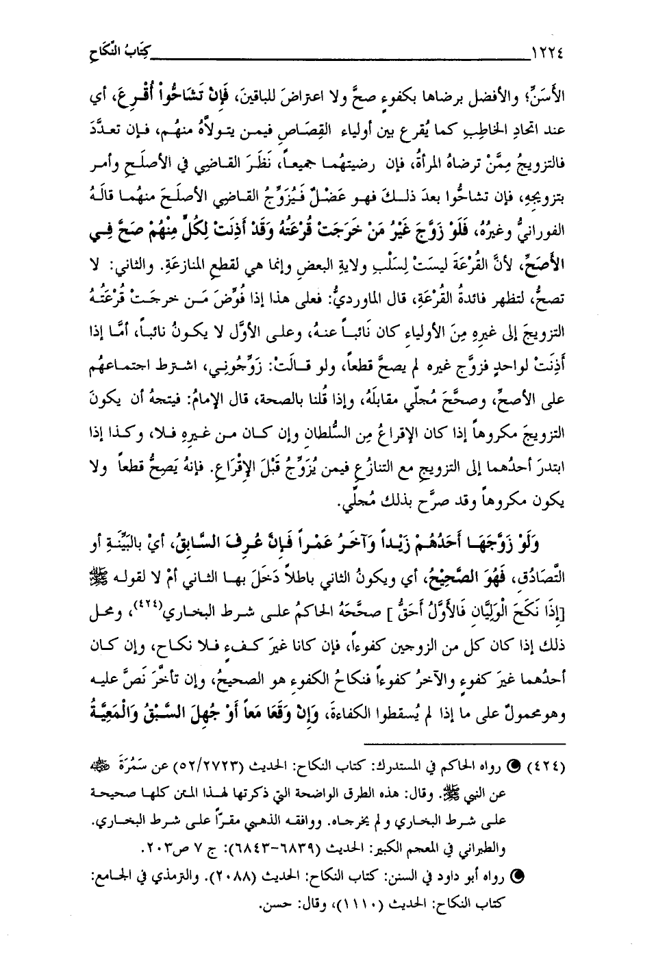 (¬424) • رواه الحاكم في المستدرك: كتاب النكاح: الحديث (2723/ 52) عن سَمُرَةَ - رضي الله عنه - ـ عن النبي - صلى الله عليه وسلم -. وقال: هذه الطرق الواضحة التي ذكرتها لهذا المتن كلها صحيحة على شرط البخاري ولم يخرجاه. ووافقه الذهبي مقرًّا على شرط البخاري. والطبراني في المعجم الكبير: الحديث (6839 - 6843): ج 7 ص 203.