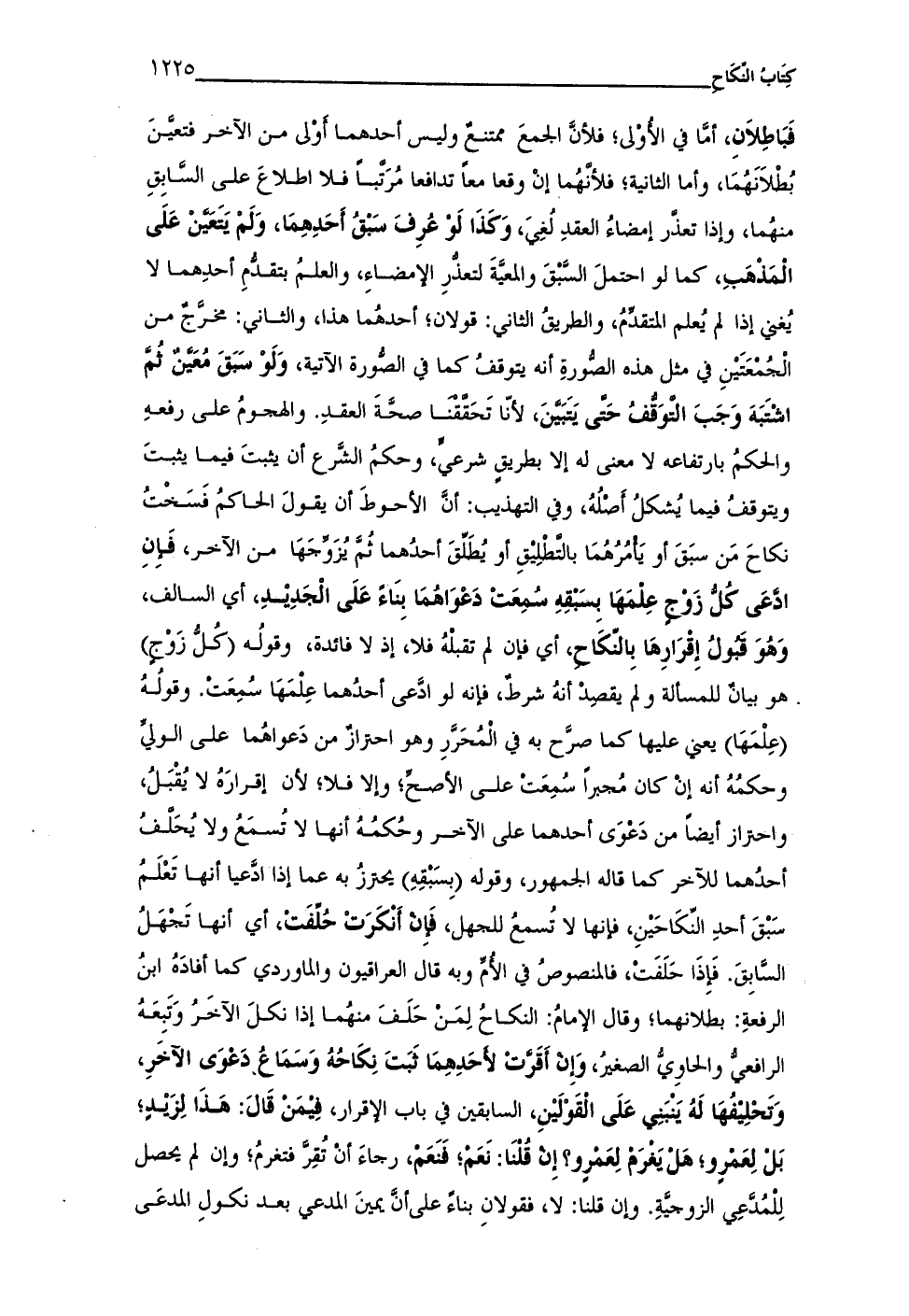فَبَاطِلاَنِ، أمَّا في الأُوْلى؛ فلأنَّ الجمعَ ممتنعٌ وليس أحدهما أَوْلى من الآخر فتعيَّنَ بُطْلاَنَهُمَا، وأما الثانية؛ فلأنَّهُما إنْ وقعا معًا تدافعا مُرَتَّبًا فلا اطلاعَ على السَّابِقِ منهُما، وإذا تعذَّر إمضاءُ العقدِ لُغِيَ، وَكَذَا لَوْ عُرِفَ سَبْقُ أحَدِهِمَا، وَلَمْ يَتَعَيَّنْ عَلَى الْمَذْهَبِ، كما لو احتملَ السَّبْقَ والمعيَّةَ لتعذُّرِ الإمضاءِ، والعلمُ بتقدُّمِ أحدِهما لا يُغني إذا لم يُعلم المتقدِّمُ، والطريقُ الثاني: قولان؛ أحدهُما هذا، والثاني: مخرَّجٌ من الْجُمْعَتَيْنِ في مثل هذه الصُّورةِ أنه يتوقفُ كما في الصُّورة الآتية، وَلَوْ سَبَقَ مُعَيَّنٌ ثُمَّ اشْتَبَهَ وَجَبَ التَّوقُّفُ حَتَّى يَتَبَيَّنَ، لأنَّا تَحَقَّقْنَا صحَّةَ العقدِ. والهجومُ على رفعهِ والحكمُ بارتفاعه لا معنى له إلا بطريق شرعي، وحكمُ الشَّرع أن يثبتَ فيما يثبتَ ويتوقفُ فيما يُشكلُ أصْلُهُ، وفي التهذيب: أنَّ الأحوطَ أن يقولَ الحاكمُ فَسَخْتُ نكاحَ مَن سبَقَ أو يَأْمُرُهُمَا بالتَّطْلِيْقِ أو يُطَلِّقَ أحدُهما ثُمَّ يُزَوِّجَهَا من الآخر، فَإِنِ ادَّعَى كُلُّ زَوْجٍ عِلْمَهَا بِسَبْقِهِ سُمِعَتْ دَعْوَاهُمَا بِنَاءً عَلَى الْجَدِيْدِ، أي السالف، وَهُوَ قَبُولُ إِقْرَارِهَا بِالنِّكَاح، أي فإن لم تقبلْهُ فلا، إذ لا فائدة، وقولُه (كُلُّ زَوْجٍ) هو بيانٌ للمسألة ولم يقصِدْ أنهُ شرطٌ، فإنه لو ادَّعى أحدُهما عِلْمَهَا سُمِعَتْ. وقولُهُ (عِلْمَهَا) يعني عليها كما صرَّح به في الْمُحَرَّرِ وهو احترازٌ من دَعواهُما على الوليِّ وحكمُهُ أنه إنْ كان مُجبرًا سُمِعَتْ على الأصحِّ؛ وإلا فلا؛ لأن إقرارَهُ لا يُقْبَلُ، واحتراز أيضًا من دَعْوَى أحدهما على الآخر وحُكمُهُ أنها لا تُسمَعُ ولا يُحَلَّفُ أحدُهما للآخر كما قاله الجمهور، وقوله (بِسَبْقِهِ) يحترزُ به عما إذا ادَّعيا أنها تَعْلَمُ سَبْقَ أحدِ النِّكَاحَيْنِ، فإنها لا تُسمعُ للجهل، فَإنْ أَنْكَرَتْ حُلِّفَتْ، أي أنها تَجْهَلُ السَّابِقَ. فَإذَا حَلَفَتْ، فالمنصوصُ في الأُمِّ وبه قال العراقيون والماوردي كما أفادَهُ ابنُ الرفعةِ: بطلانهما؛ وقال الإمامُ: النكاحُ لِمَنْ حَلَفَ منهُما إذا نكلَ الآخَرُ وَتَبِعَهُ الرافعىُّ والحاوِيُّ الصغيرُ، وَإنْ أَقَرْتْ لأَحَدِهِمَا ثَبَتَ نِكَاحُهُ وَسَمَاعُ دَعْوَى الآخَرِ، وَتَحْلِيْفُهَا لَهُ يَنْبَنِي عَلَى الْقَوْلَيْنِ، السابقين في باب الإقرار، فِيْمَنْ قَالَ: هَذَا لِزَيْدٍ؛ بَلْ لِعَمْرٍو؛ هَلْ يَغْرَمْ لِعَمْرٍو؟ إِنْ قُلْنَا: نَعَمْ؛ فَنَعَمْ، رجاءَ أنْ تُقِرَّ فتغرمُ؛ وإن لم يحصل لِلْمُدَّعِى الزوجيَّةِ. وإن قلنا: لا، فقولانِ بناءً على أنَّ يمينَ المدعي بعد نكولِ المدعَى