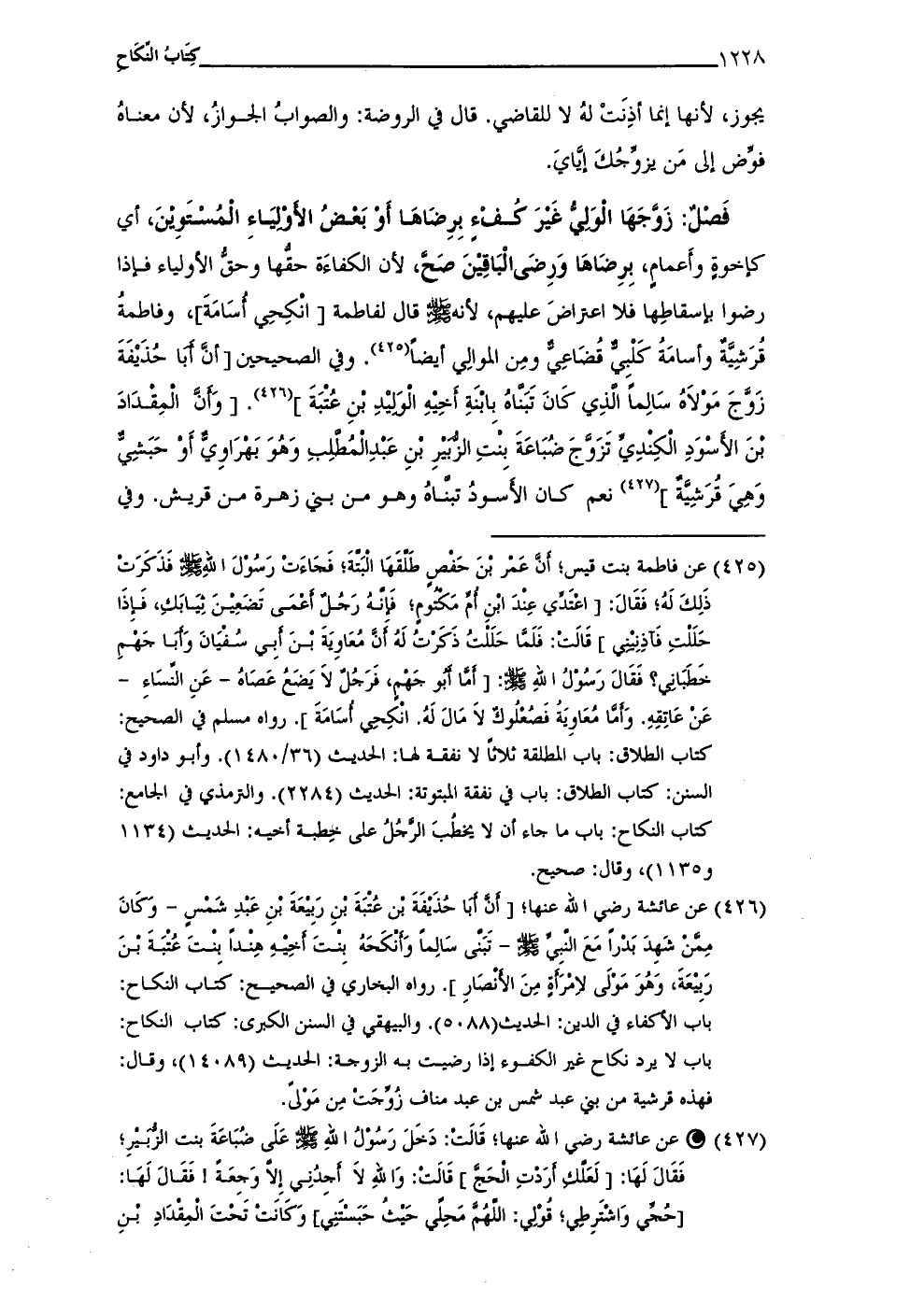 (¬426) عن عائشة رضي الله عنها؛ [أَنَّ أَبَا حُذَيْفَةَ بْن عُتْبَةَ بْنِ رَبيْعَةَ بْنِ عَبْدِ شَمْسٍ - وَكَانَ مِمَّن شَهدَ بَدْرًا مَعَ النَّبيِّ - صلى الله عليه وسلم - تَبَنَّى سَالِمًا وَأَنْكَحَهُ بِنْتَ أَخِيْهِ هِنْدًا بِنْتَ عُتْبَةَ بْنَ رَبِيْعَةَ، وَهُوَ مَوْلَى لامْرَأةٍ مِنَ الأَنْصَارِ]. رواه البخاري في الصحيح: كتاب النكاح: باب الأكفاء في الدين: الحديث (5088). والبيهقي في السنن الكبرى: كتاب النكاح: باب لا يرد نكاح غير الكفوء إذا رضيت به الزوجة: الحديث (14089)، وقال: فهذه قرشية من بني عبد شمس بن عبد مناف زُوِّجَتْ من مَوْلىَ.