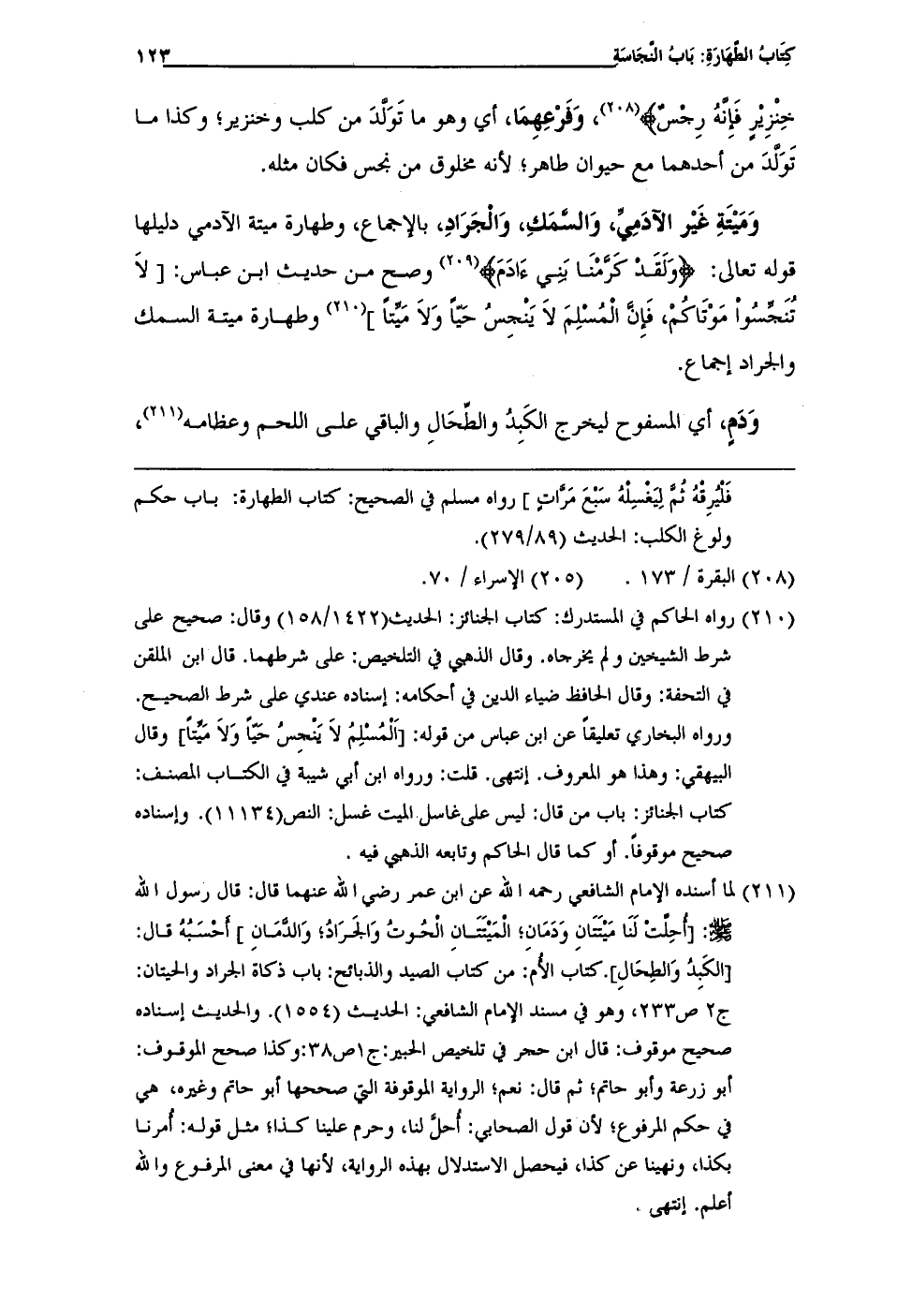 وَمَيْتَةِ غَيْر الآدَمِيِّ، وَالسَّمَكِ، وَالْجَرَادِ، بالاجماع، وطهارة ميتة الآدمى دليلها قوله تعالى: {وَلَقَدْ كَرَّمْنَا بَنِي آدَمَ} (¬209) وصح من حديث ابن عباس: [لاَ تُنَجِّسُواْ مَوْتَاكُمْ، فَإِنَّ الْمُسلِمَ لاَ يَنْجِسُ حَيِّاً وَلاَ مَيِّتاً] (¬210) وطهارة ميتة السمك والجراد إجماع.