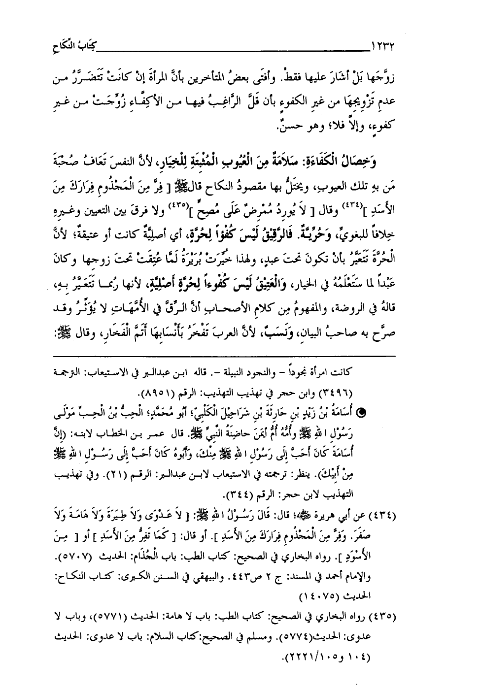 (¬434) عن أبي هريرة - رضي الله عنه -؛ قال: قَالَ رَسُوْلُ اللهِ - صلى الله عليه وسلم -: [لَا عَدْوَى وَلَا طِيَرَةَ وَلَا هَامَةَ وَلَا صَفَرَ. وَفِرَّ مِنَ الْمَجْذُومِ فِرَارَكَ مِنَ الأَسَدِ]. أو قال: [كَمَا تَفِرُّ مِنَ الأَسَدِ] أو [مِنَ الأَسْوَدِ]. رواه البخاري فِي الصحيح: كتاب الطب: باب الْجُذَام: الحديث (5707). والإمام أحمد فِي المسند: ج 2 ص 443. والبيهقى فِي السنن الكبرى: كتاب النِّكَاح: الحديث (14075)