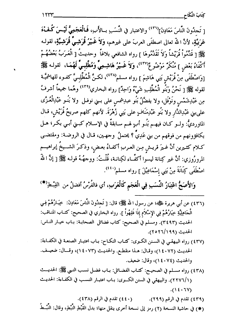 (¬438) رواه مسلم فِي الصحيح: كتاب الفضائل: باب فضل نسب النبي - صلى الله عليه وسلم -: الحديث (1/ 2276). والبيهقى فِي السنن الكبرى: باب اعتبار النسب فِي الكفاءة: الحديث (14067).