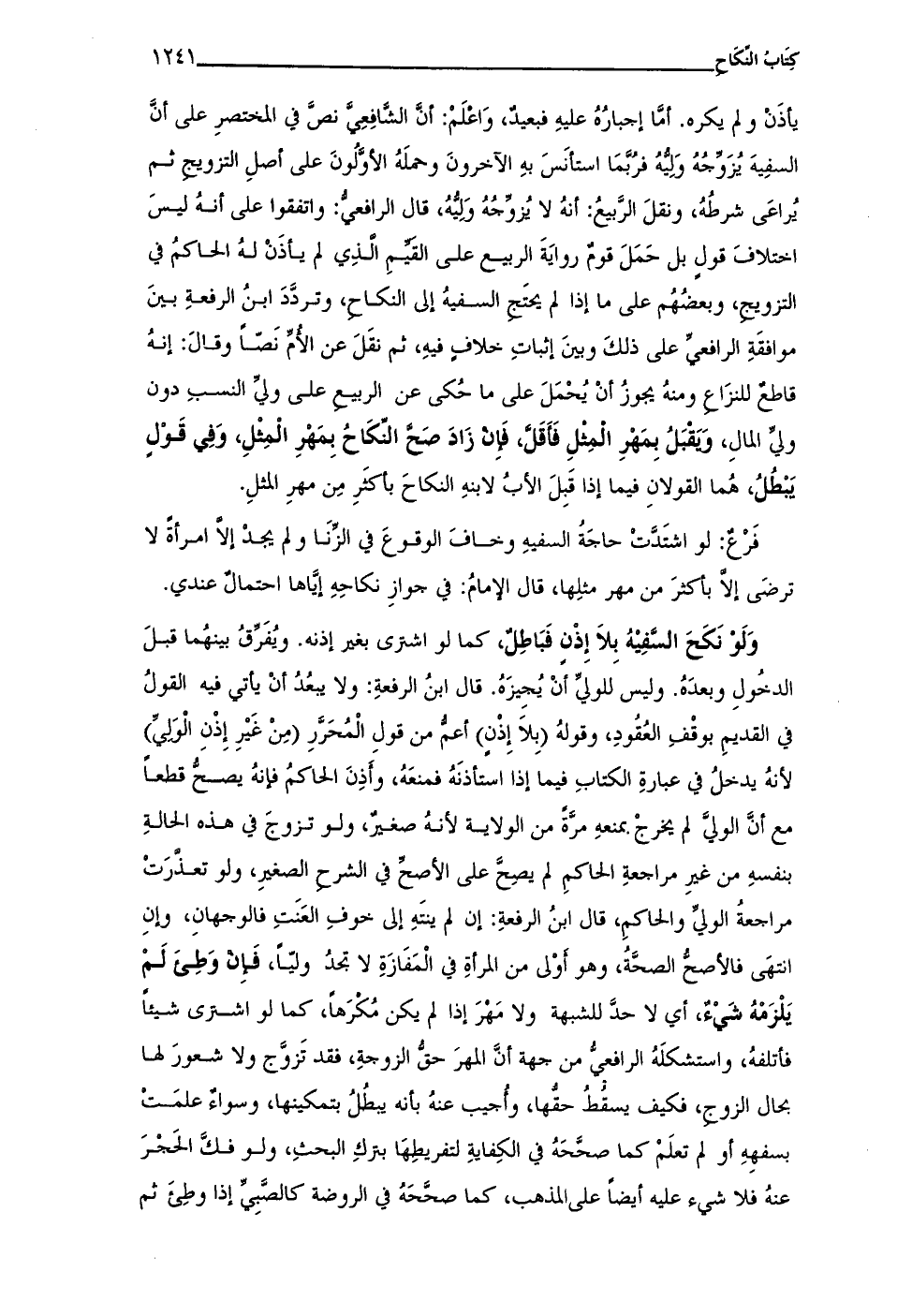 فَرْعٌ: لو اشتَدَّتْ حاجَةُ السفيهِ وخافَ الوقوعَ فِي الزِّنَا ولم يجدْ إلَّا امرأةً لا ترضَى إلَّا بأكثرَ من مهر مثلِها، قال الإِمامُ: فِي جرازِ نكاحِهِ إيَّاها احتمالٌ عندي.