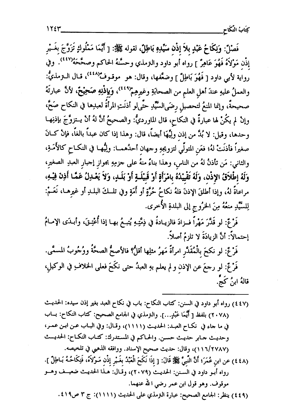 (¬447) رواه أبو داود في السنن: كتاب النكاح: باب في نكاح العبد بغير إذن سيده: الحديث (2078) بلفظ [أيَّمَا عَبد ... ]. والترمذى في الجامع الصحيح: كتاب النكاح: باب في ما جاء في نكاح العبد: الحديث (1111)، وقال: وفي الباب عن ابن عمر، وحديث جابر حديث حسن. والحاكم في المستدرك: كتاب النكاح: الحديث (2787/ 116)، وقال: حديث صحيح الإسناد. ووافقه الذهبي في تلخيصه.