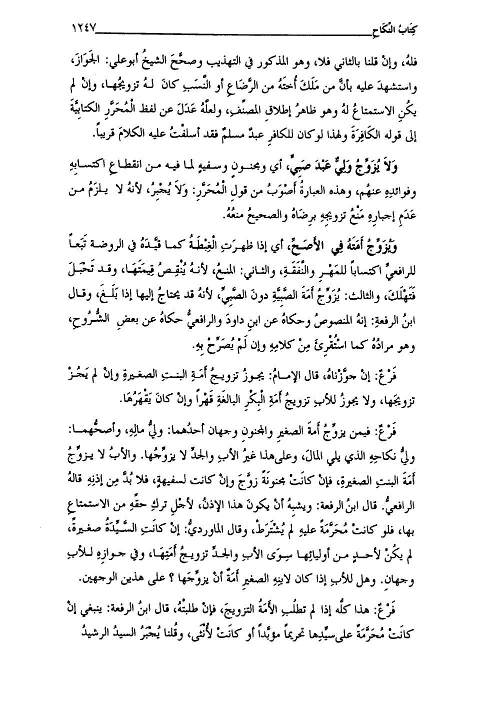 فَرْعٌ: فيمن يزوجُ أمةَ الصغيرِ والمجنونِ وجهان أحدُهما: وليُّ مالِهِ، وأصحُّهما: وليُّ نكاحِهِ الذي يلى المالَ، وعلى هذا غيرُ الأبِ والجدِّ لا يزوجُها. والأبُ لا يزوّجُ أمَةَ البنتِ الصغيرةِ، فإنْ كانَتْ مجنونَة زوَّجَ وإنْ كانت لسفيهةِ، فلا بُدَّ مِن إذنِهِ قالهُ الرافعي. قال ابنُ الرفعة: ويشبِهُ أن يكونَ هذا الإذنُ، لأجْلِ تركِ حقَّهِ من الاستمتاعِ بها، فلو كانتْ مُحَرَّمَة عليهِ لم يُشْتَرَط، وقال الماوردىُّ: إنْ كانَتِ السيِّدَة صغيرة، لم يكُنْ لأحد من أوليائِها سِوَى الأبِ والجد تزويجُ أمَتِهَا، وفي جوازِهِ للأبِ وجهانِ. وهل للأبِ إذا كان لابنهِ الصغيرِ أَمَةٌ أنْ يزوجها؟ على هذين الوجهين.