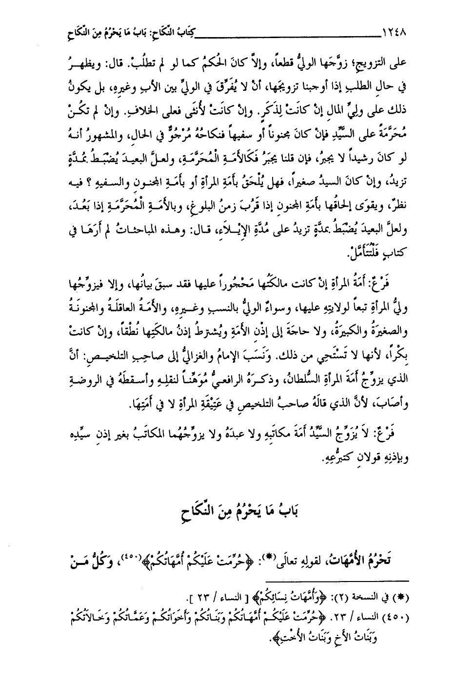 على التزويج؛ زوَّجَها الوليُّ قطعًا، وإلَّا كانَ الحُكمُ كما لو لم تطلُب. قال: ويظهرُ في حالِ الطلبِ إذا أوجبنا تزويجَها، أنْ لا يُفَرق في الوليّ بين الأبِ وغيرِهِ، بل يكونُ ذلك على وليِّ المالِ إنْ كانَتْ لِذَكَرِ. وإنْ كانت لأنثَى فعلى الخلافِ. وإن لم تكُنْ مُحَرَّمَةَ على السيدِ فإنْ كانَ مجنونًا أو سفيهاً فنكاحُهُ مُرْجُوٌّ في الحالِ، والمشهورُ أنهُ لو كانَ رشيداً لا يجبرُ، فإن قلنا يجبَرُ فَكَالأمَةِ المُحَرَّمَةِ، ولعل البعيدَ يُضبطُ بمدَّةٍ تزيدُ، وإنْ كانَ السيدُ صغيراً، فهل يُلْحَقُ بأمَةِ المرأةِ أو بأمَةِ المجنونِ والسفيهِ؟ فيه نظر، ويقوَى إلحاقُها بأمَةِ المجنونِ إذا قربَ زمنُ البلوغ، وبالأمَةِ الْمُحَرَّمةِ إذا بَعُدَ، ولعل البعيدَ يضبطُ بمدَّة تزيدُ على مُدةِ الإيْلاَءِ، قال: وهذه المباحثاتُ لم أَرَهَا في كتابٍ فَلتتَأمَّل.