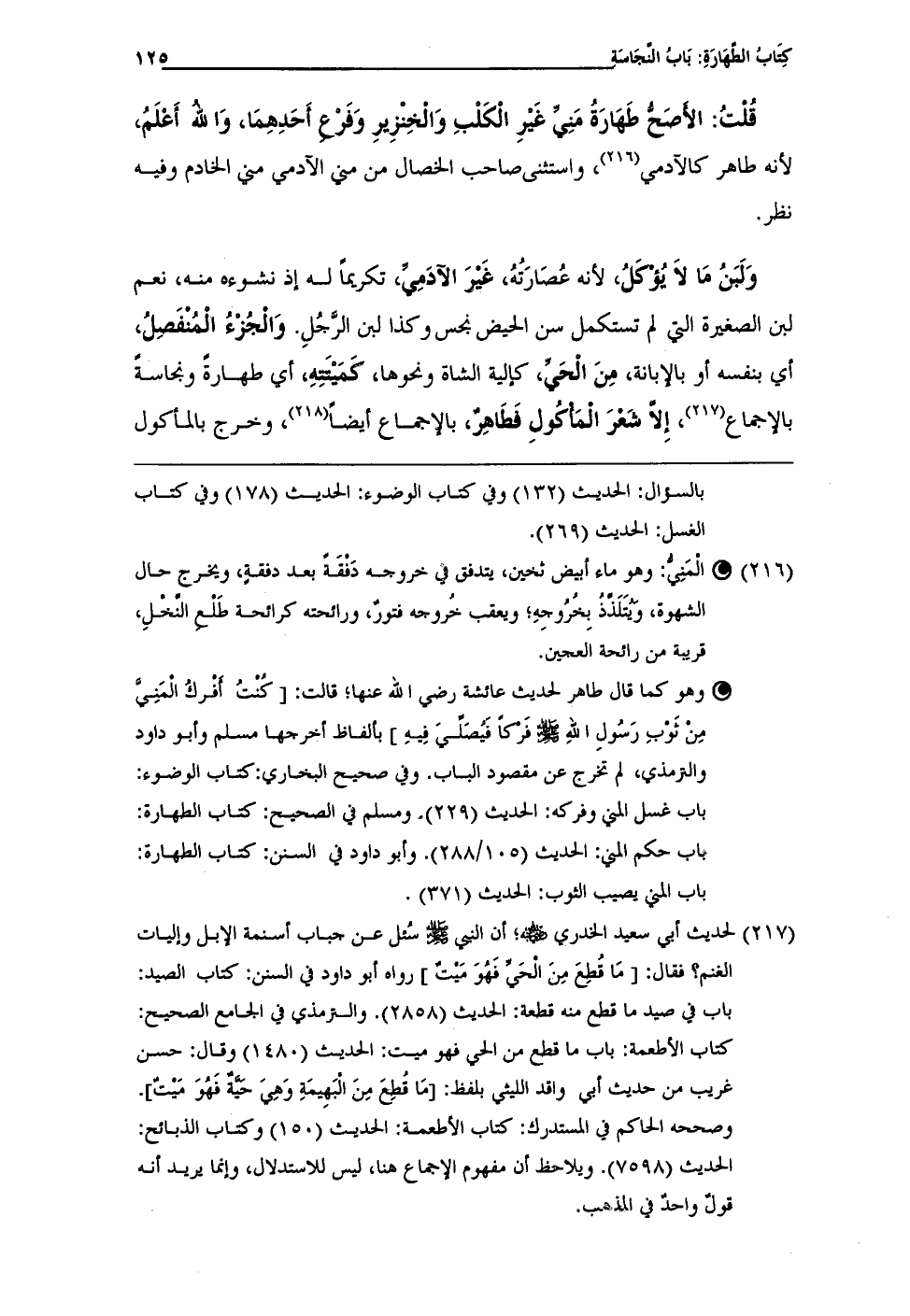 (¬217) لحديث أبى سعيد الخدري - رضي الله عنه -؛ أن النبي - صلى الله عليه وسلم - سُئل عن جباب أسنمة الإبل وإليات الغنم؟ فقال: [مَا قُطِعَ مِنَ الْحَيِّ فَهُوَ مَيْتٌ] رواه أبو داود في السنن: كتاب الصيد: باب في صيد ما قطع منه قطعا: الحديث (2858). والترمذي في الجامع الصحيح: