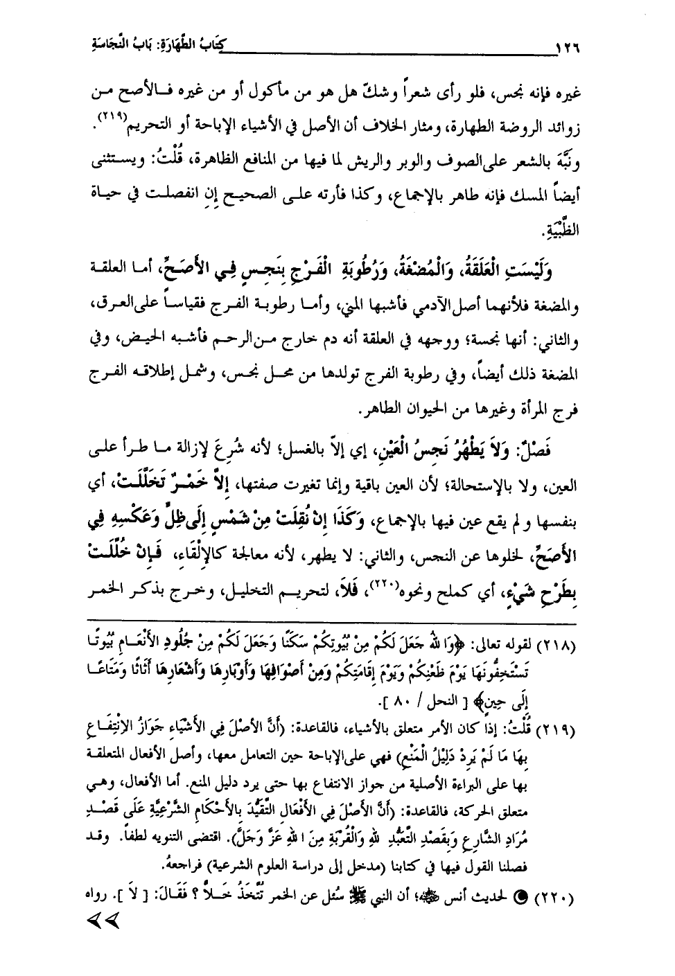 (¬219) قُلْتُ: إذا كان الأمر متعلق بالأشياء، فالقاعدة: (أَنَّ الأصْلَ فِي الأَشْيَاءِ جَوَازُ الإِنْتِفَاعِ بِهَا مَا لَمْ يَرِدْ دَلِيْلُ الْمَنْعِ) فهي على الإباحة حين التعامل معها، وأصل الأفعال المتعلقة بها على البراءة الأصلية من جواز الانتفاع بها حتى يرد دليل المنع. أما الأفعال، وهي متعلق الحركة، فالقاعدة: (أَنَّ الأَصْلَ فِي الأَفْعَالِ التَّقَيُّدَ بِالأَحْكَامِ الشَّرْعِيَّةِ عَلَى قَصْدِ مُرَادِ الشَّارِعِ وَبِقَصْدِ التَّعَبُّدِ للهِ وَالْقُرْبَةِ مِنَ اللهِ عَزَّ وَجَلَّ). اقتضى التنويه لطفاً. وقد فصلنا القول فيها في كتابنا (مدخل إلى دراسة العلوم الشرعية) فراجعهُ.