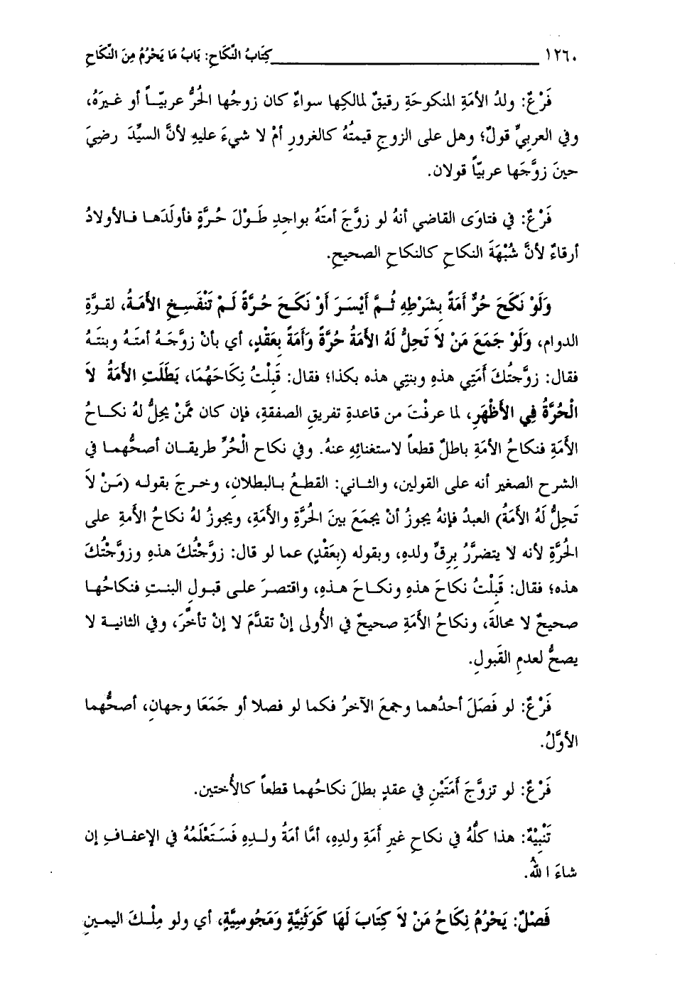 وَلَوْ نَكَحَ حُر أَمَةً بِشَرْطِهِ ثُمَّ أَيْسَرَ أَوْ نَكَحَ حُرَّة لَم تَنْفَسِخ الأمَةُ، لقوَّةِ الدوام، وَلَوْ جَمَعَ مَنْ لاَ تَحِل لَهُ الأمَةُ حُرَّة وَأَمَةً بِعَقْدٍ، أي بأنْ زوجهُ أمتَهُ وبنتَهُ فقال: زوَّجتُكَ أمَتِى هذهِ وبنتي هذه بكذا؟ فقال: قَبِلْتُ نِكَاحَهُمَا، بَطَلَتِ الأمَةُ لاَ الْحُرَّةُ في الأظْهَرِ، لما عرفْتَ من قاعدةِ تفريقِ الصفقةِ، فإن كما كان ممَّنْ يحِلُّ لهُ نكاحُ الأمَةِ فنكاحُ الأمَةِ باطل قطعًا لاستغنائِهِ عنهُ. وفي نكاح الحُرِّ طريقان أصحهما في الشرح الصغير أنه على القولين، والثانى: القطعُ بالبطلانِ، وخرجَ بقوله (مَنْ لاَ تَحِلُّ لَهُ الأمَةُ) العبدُ فإنهُ يجوزُ أنْ يجمَعَ بينَ الحُرة والأمَةِ، ويجوزُ لهُ نكاحُ الأمةِ على الحُرة لأنه لا يتضرَّرُ بِرِق ولدهِ، وبقوله (بعَقْدِ) عما لو قال: زوجتُك هذهِ وزوجتُكَ هذه؛ فقال: قَبِلْتُ نكاحَ هذهِ ونكاحَ هذهِ، واقتصرَ على قبولِ البنتِ فنكاحُها صحيحٌ لا محالةَ، ونكاحُ الأمَةِ صحيح في الأولى إنْ تقدَّمَ لا إنْ تأخْرَ، وفي الثانية لا يصحُّ لعدمِ القبولِ.