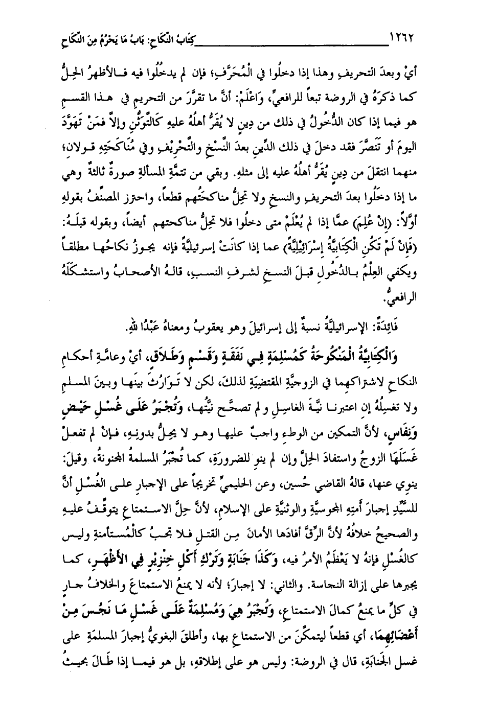 وَالْكِتَابِيَّةُ الْمَنْكُوحَةُ كَمُسْلِمَةٍ فِي نَفَقَةٍ وَقَسْمٍ وَطَلاَقٍ، أيْ وعامَّةِ أحكامِ النكاحِ لاشتراكهِما في الزوجيَّةِ المقتضِيَةِ لذلكَ، لكن لا تَوَارُثَ بينَها وبينَ المسلمِ ولا تغسِلُهُ إنِ اعتبرنا نيَّةَ الغاسِلِ ولم تصحَّح نيَّتُها، وَتُجْبَرُ عَلَى غُسْلِ حَيْضٍ وَنِفَاسٍ، لأنَّ التمكين من الوطءِ واجبٌ عليها وهو لا يحِلُّ بدونِهِ، فإن لم تفعل غَسَلَهَا الزوجُ واستفادَ الحِلَّ وإن لم ينوِ للضرورَةِ، كما تُجْبَرُ المسلمةُ المجنونةُ، وقيلَ: ينوِي عنها، قالهُ القاضي حُسين، وعن الحليميِّ تخريجاً على الإجبارِ على الغُسْلِ أنَّ للسَّيِّدِ إجبارَ أَمتِهِ المجوسيَّةِ والوثنيَّةِ على الإسلامِ، لأنَّ حِلَّ الاستمتاعِ يتوقَّفُ عليهِ والصحيحُ خلافُهُ لأنَّ الرِّقَّ أفادَها الأمانَ مِن القتلِ فلا تجبُ كالْمُستأمنةِ وليس كالغُسْلِ فإنهُ لا يَعْظَمُ الأمرُ فيه، وَكَذَا جَنَابَةٍ وَتَرْكِ أَكْلِ خِنْزِيرِ فِي الأطهَرِ، كما يجبرها على إزالة النجاسة. والثاني: لا إجبارَ؛ لأنه لا يمنعُ الاستمتاعَ والخلافُ جارٍ في كلِّ ما يمنعُ كمالَ الاستمتاعِ، وَتُجْبَرُ هِيَ وَمُسْلِمَةٌ عَلَى غَسْلِ مَا نَجُسَ مِنْ أَعْضَائِهِمَا، أي قطعاً ليتمكَّنَ من الاستمتاع بها، وأطلقَ البغويُّ إجبارَ المسلمَةِ على غسل الجَنابَةِ، قال في الروضة: وليس هو على إطلاقهِ، بل هو فيما إذا طَالَ بحيثُ
